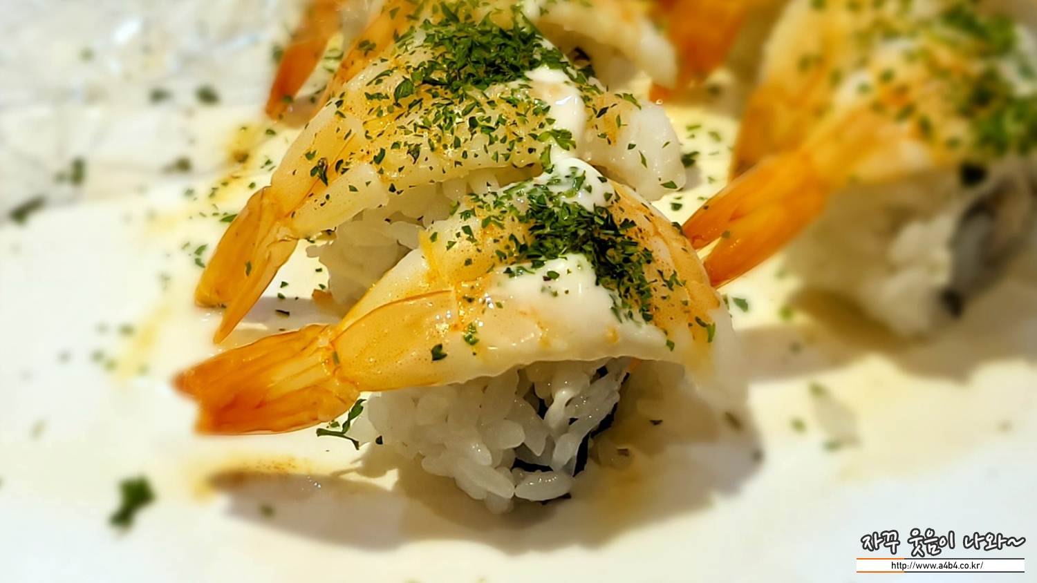 광어초밥, 연어초밥, 육회초밥, 참치초밥, 참치타다끼초밥, 생연어초밥, 생새우초밥, 새우장초밥, 치즈새우초밥, 문어초밥, 한치초밥, 가리비초밥, 참소라초밥, 장어초밥, 소고기초밥, 훈제오리초밥, 계란초밥 등을 맛볼 수 있습니다.