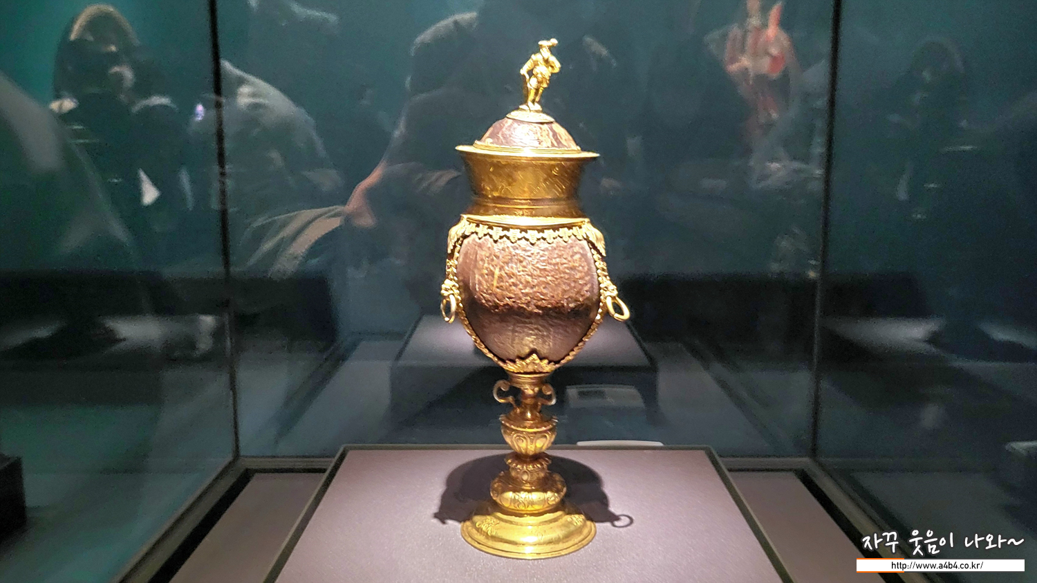 17세기로의 전환기 대항해 시대에 유럽의 항해사 들과 상인들은 외국에서 온갖 이국적인 물건들을 들여왔다. 낯선 물건에 값비싼 부속을 장식해서 만든 공예품들은 유럽의 예술 애호가들과 수집가들 에게 높은 평가를 받았다. 당시 유럽인은 야자 열매를 해독제와 치료제로 여겼기 때문에 야자열매 를 잔으로 변형시킨 작품이 드물지 않게 제작됐다. 뚜껑에는 ‘란츠크네히트’라고 부르는 16세기 용병 복장을 한 작은 인물상이 있다.
