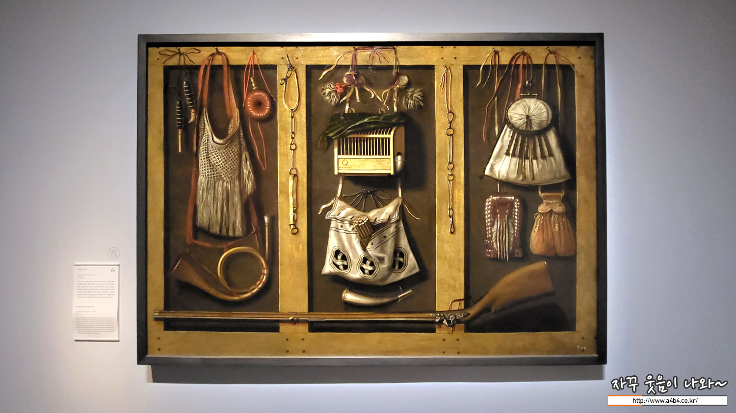 그림은 매 사냥과 연관된 도구가 벽에 실제로 걸린 것처럼 묘사했다. 화면 하단에 길게 놓인 총이 있고, 작은 새장과 모자, 미끼를 넣는 주머니, 호루라기 등이 보인다. 실제로 존재하는 것처럼 그린 ‘ 트롱프뢰유’ , 즉 눈속임 기법의 그림은 17세기 중엽 정물화의 하위 장르로 발전했다. 눈속임 정물화는 작품이 걸릴 장소의 빛의 방향까지 고려해 주문 되었을 정도로 사실적인 세부 묘사를 주된 특징으로 했다.