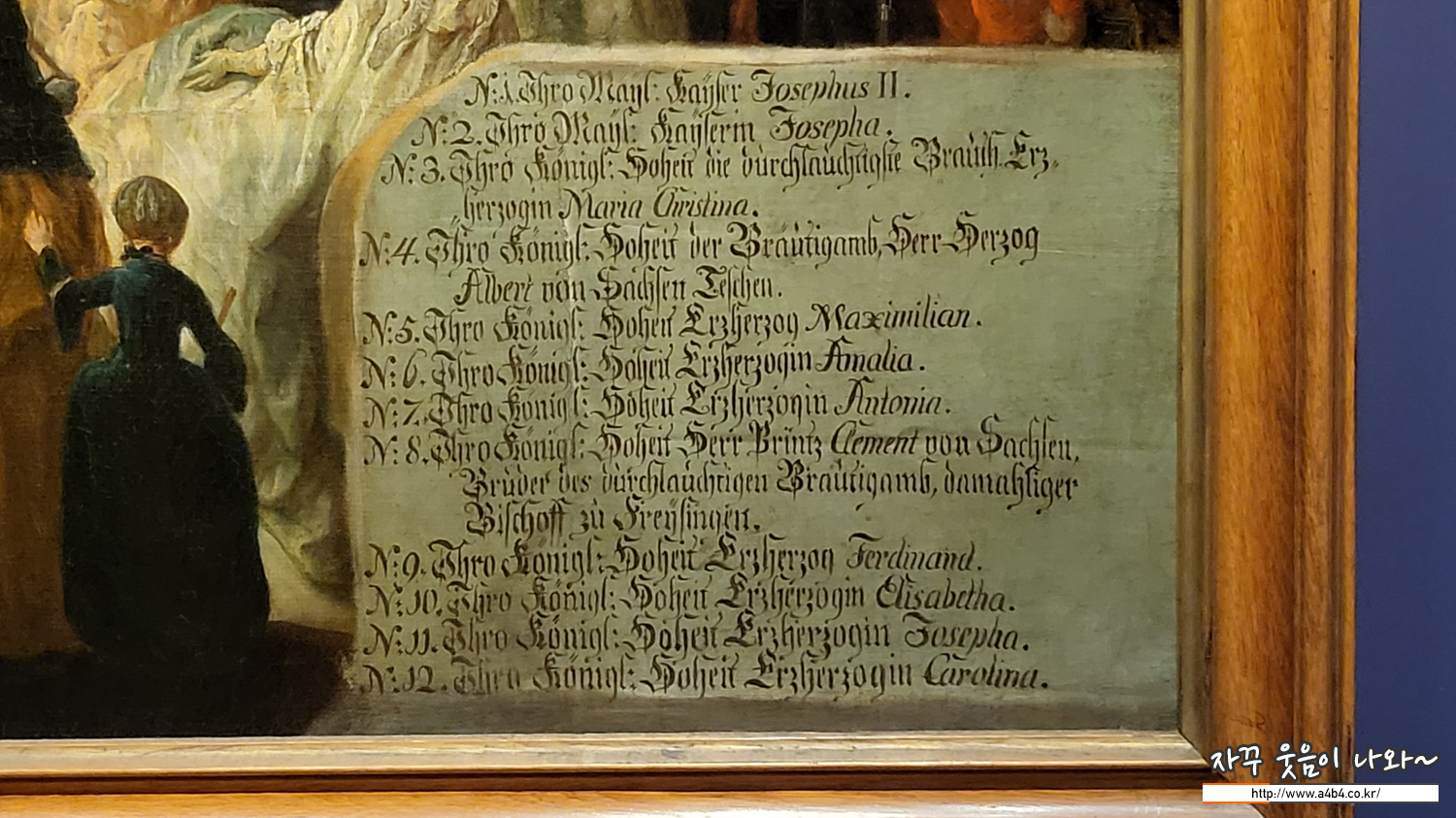 “시시”로도 불리는 엘리자베트는 오스트리아 국민 이 가장 사랑하는 황후이다. 초상화는 그녀가 21세 때 모습을 그린 것으로 어두운 배경에 밝은 푸른빛 드레스가 미모를 돋보이게 한다. 프란츠 요제프 1세는 그녀를 보자마자 사랑에 빠져 결혼했지만, 비교적 자유로운 환경에서 성장한 엘리자베트에게 엄격한 황실은 감옥과 같았다. 결국 오스트리아에 마음을 붙이지 못한 비운의 황후 엘리자베트는 1898년 제네바 여행 도중 이탈리아인 무정부주의자 에게 암살당하고 만다.