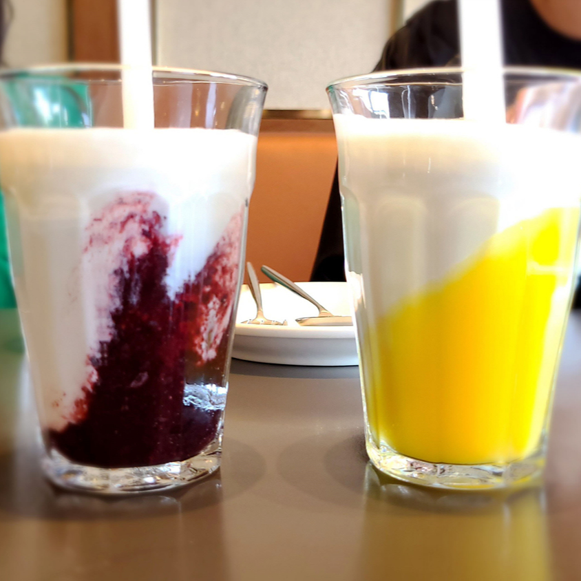라씨는 인도 전통 요구르트 생각하시면 됩니다. 플레인라씨와 과일이 믹스된 라씨가 있는데요. 오늘은 블루베리 라씨와 망고 라씨를 선택했습니다. 세트메뉴 음료는 탄산음료나 라씨 선택이 가능합니다. 이번에 주문한 라씨는 색상이 너무 이쁘네요.
