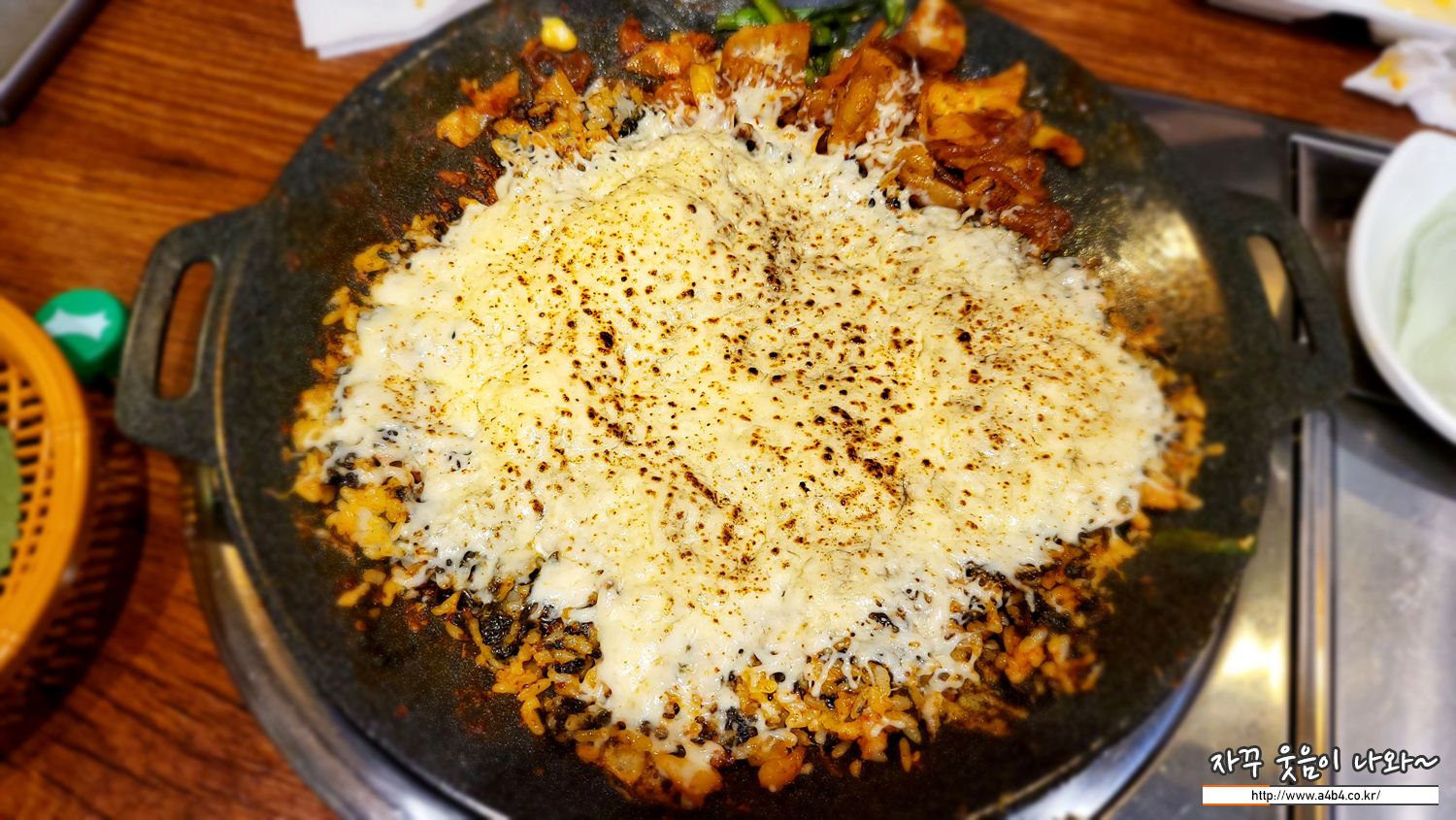 치즈 말치알 볶음밥 2인 분 입니다. 먼저 볶음밥이 올라오고 그 위에 치즈가루를 뿌려 줍니다.