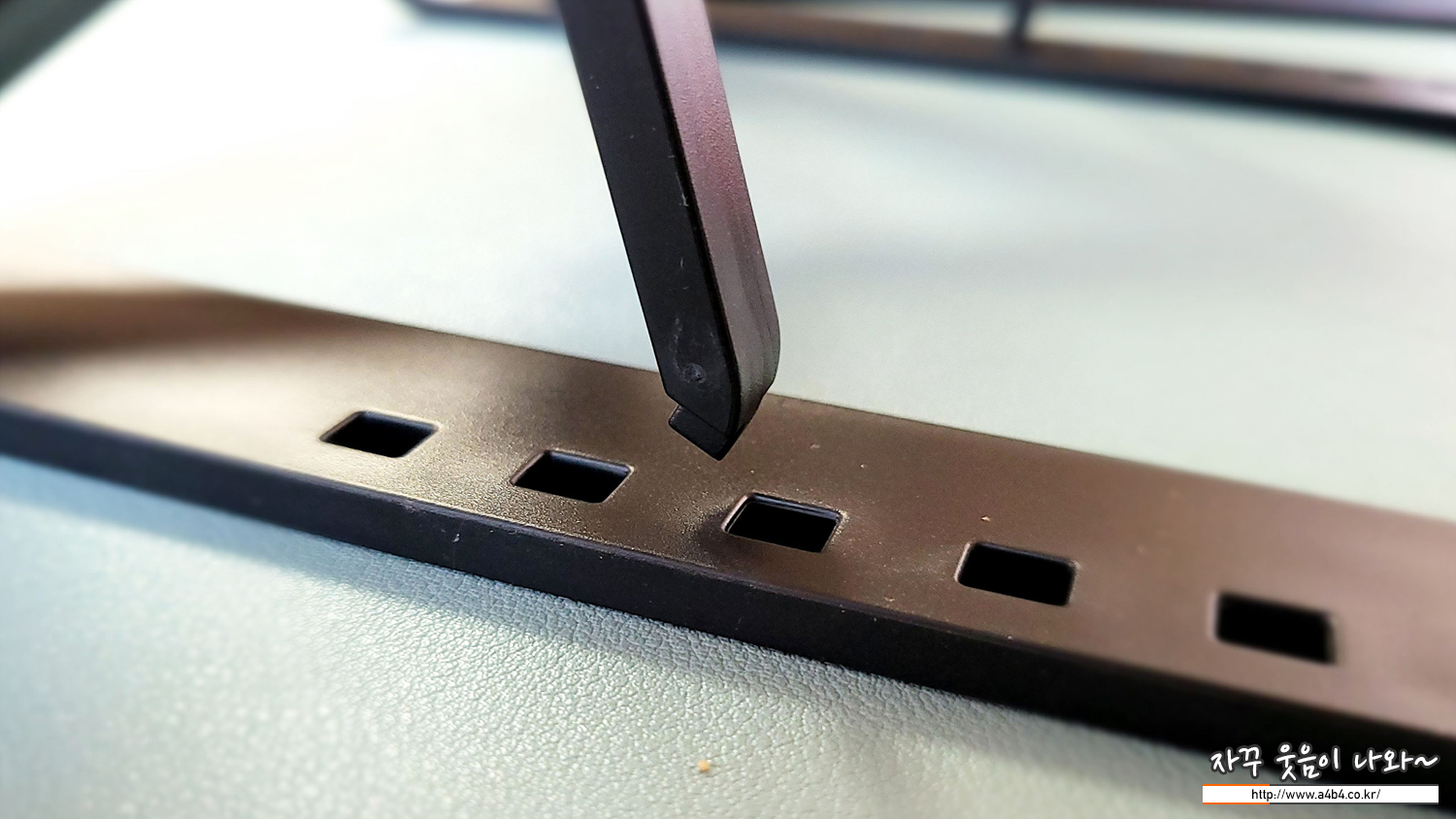어뮤즈하우스 노트북 거치대는 하단에 10개의 홈이 있어 거치대 각도를 조절하는 방식입니다. 양쪽 구멍 각각 거치여서 각각 구명위치 확인하시고 거치하셔야 합니다.