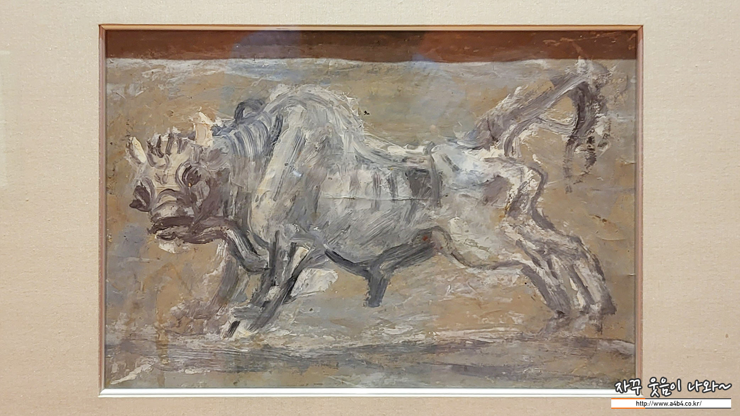 붉은 바탕을 배경으로 황소가 입을 크게 벌리고 울부짓고 있습니다. 크게 치뜬 순한 눈망울엔 슬픔이 묻어납니다. 한국인의 '국민 화가' 이중섭의 빼놓을 수 없는 대표작 '황소'입니다. 역동적인 붓놀림과 거친 선으로 황소를 생동감 있게 그렸을 뿐만 아니라 세상의 모든 기운을 응집한 것 같은 강력한 힘을 화폭에 담았습니다.