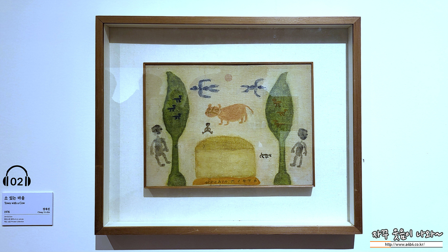 그림 중앙에 소가 있고, 하늘에는 새 두 마리가 다른 방향을 향해 날아 갑니다. 나무 두 그루와 그 옆에 서 있는 사람이 좌우 대칭구도를 이룹니다. 단조로운 화면 구성을 깨뜨리기 위해 소 옆에 깨알처럼 아이와 개를 넣어 작가 특유의 유머를 담았습니다. 어린 아이가 그린 것처럼 천진난만한 화풍이 인상적인 장욱진의 작품입니다. 나무, 아이, 집, 새, 마을.. 장욱진의 그림에 등장하는 단골 소재가 한 화면에 소박한 색채,간결한 형태로 담겼습니다. '작은 그림' 예찬론자인 장욱진답게 이 그림 역시 작고 단순합니다. 장욱진은 "그림이 커지면 싱거워진다. 작은 그림은 친절하고 치밀하다"면서 어린이의 마음으로 세상을 바라봤습니다.