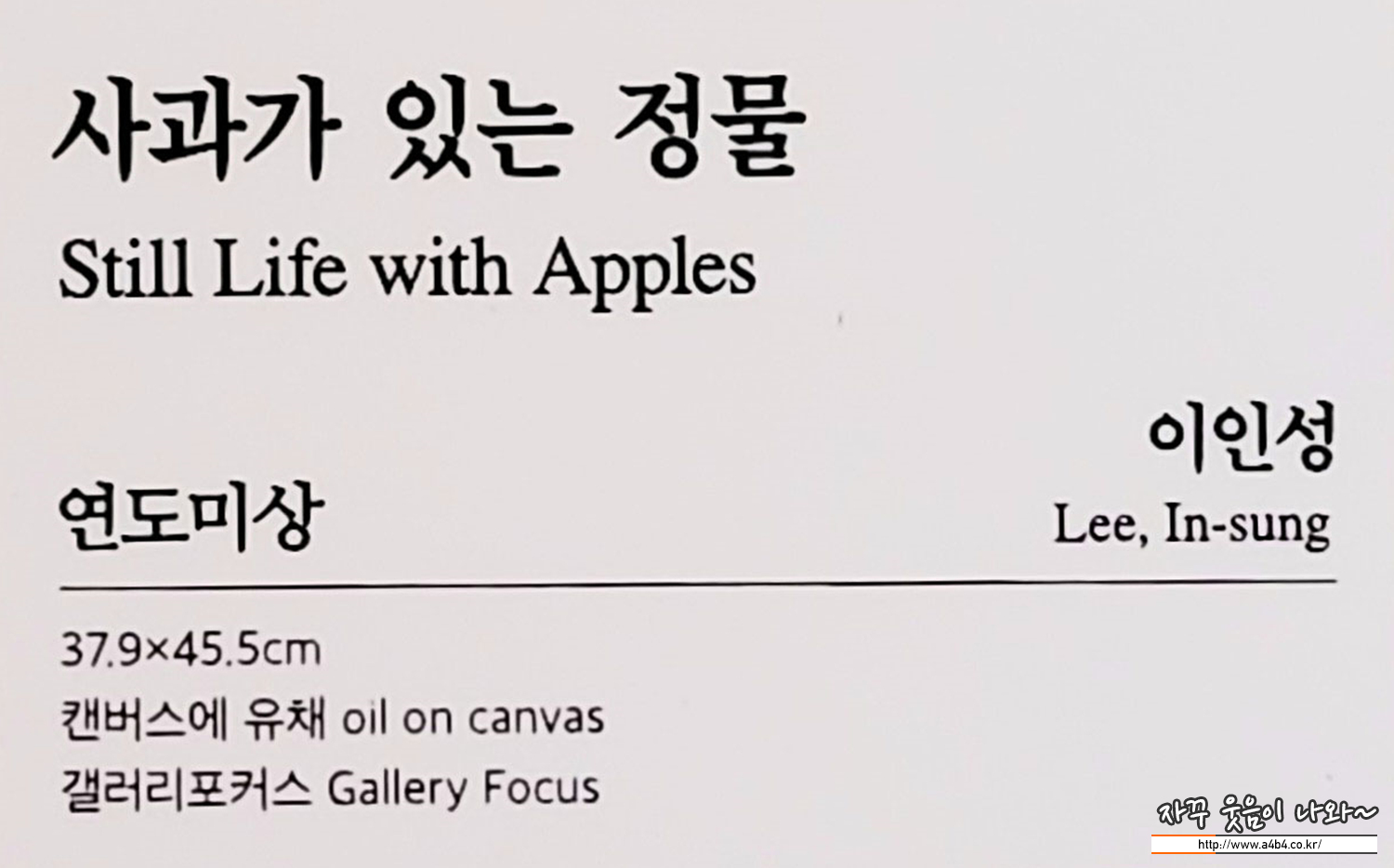 조선의 고갱'이라 불리는 천재화가 이인성이 즐겨 그린 소재가 있습니다. 바로 자신의 고향 대구의 지역 특산물인 사과입니다. 이인성이 화가의 꿈을 키우며 살던 대구 산격동엔 '이인성 사과나무길'이 있을 정도입니다. 이 작품은 이인성의 각별한 사과 사랑과 함께 탁월한 색감과 조형 감각을 보여주는 정물화입니다. 자연스러운 화면 구성, 붉은 색과 녹색의 대비가 인상적인 작품입니다.정확한 제작 연도는 알 수 없으나 서명으로 연대를 추정할 수 있습니다. 이인성은 시기에 따라 다른 서명을 썼는데, 이 작품에서 보이는 영어 대문자 서명은 1940년대 이후 작품에서 주로 보입니다. 이인성은 1950년 경찰관 총기 오발 사고로 38세의 나이에 황망하게 세상을 떴습니다.