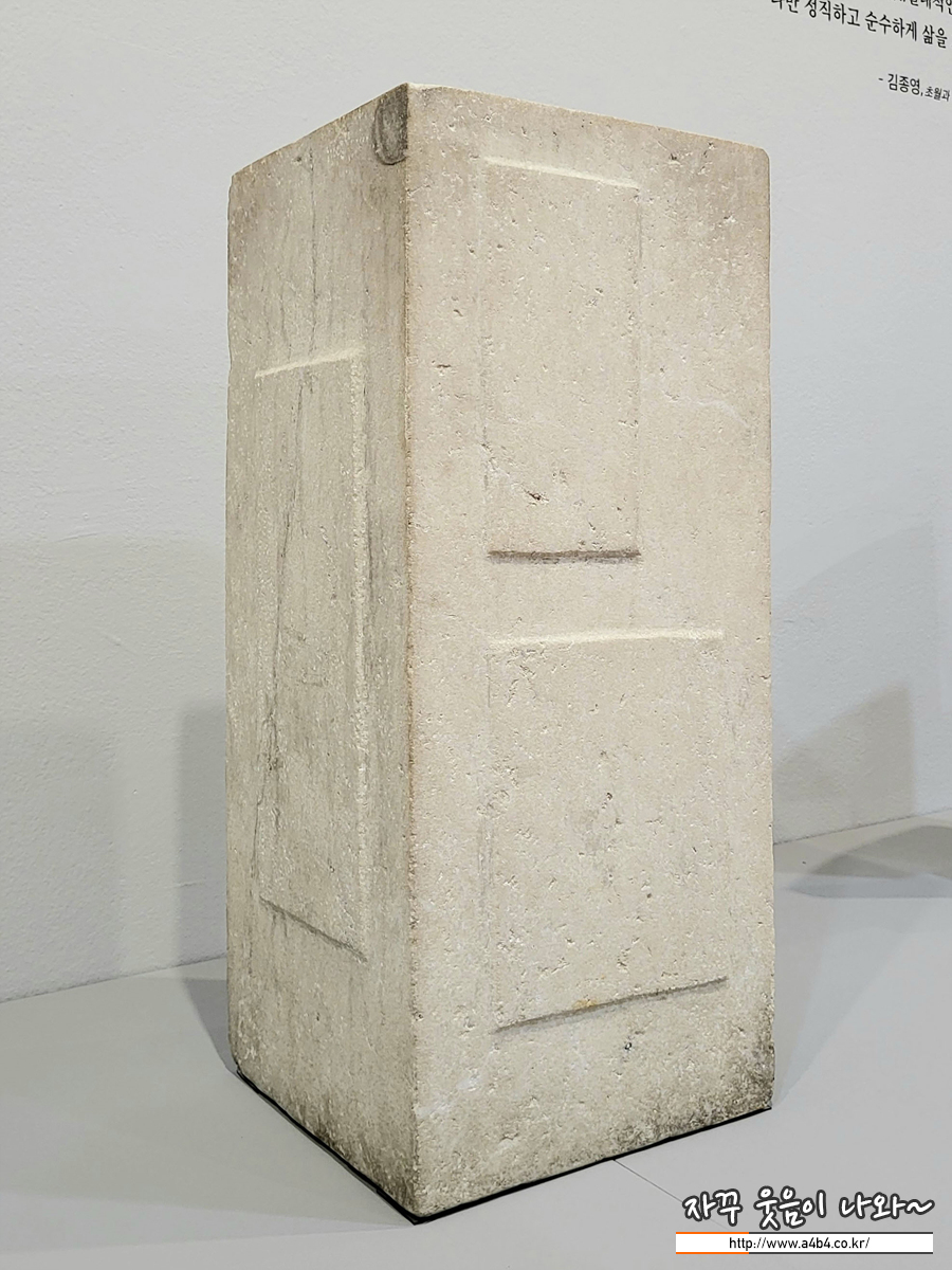 얼핏 보면 묘비석처럼 보이기도 하는 이 조각은 '한국 추상 조각의 선구자'인 김종영의 작품입니다. 흰색을 띠는 직육면체의 석재 표면에 돋을새김으로 사각의 면을 나타냈습니다. 김종영은 지나치게 다듬는 행위를 절제해 재료의 간결하면서도 견고한 구조적인 아름다움을 드러내는 데 집중했습니다. 깊이 있는 사유와 통찰을 바탕으로 자연의 질서에 접근하고자 했던 작가의 조형관이 엿보이는 작품입니다. 김종영은 '불각의 미'를 조형 철학으로 삼았습니다. '깍지 않는다'는 의미이기도 하지만 '깎지만 부단히 깎지 않는 상태를 지향한다'는 얘기입니다. 그는 평생 선비와 같은 태도로 생명의 근원을 탐구했습니다.