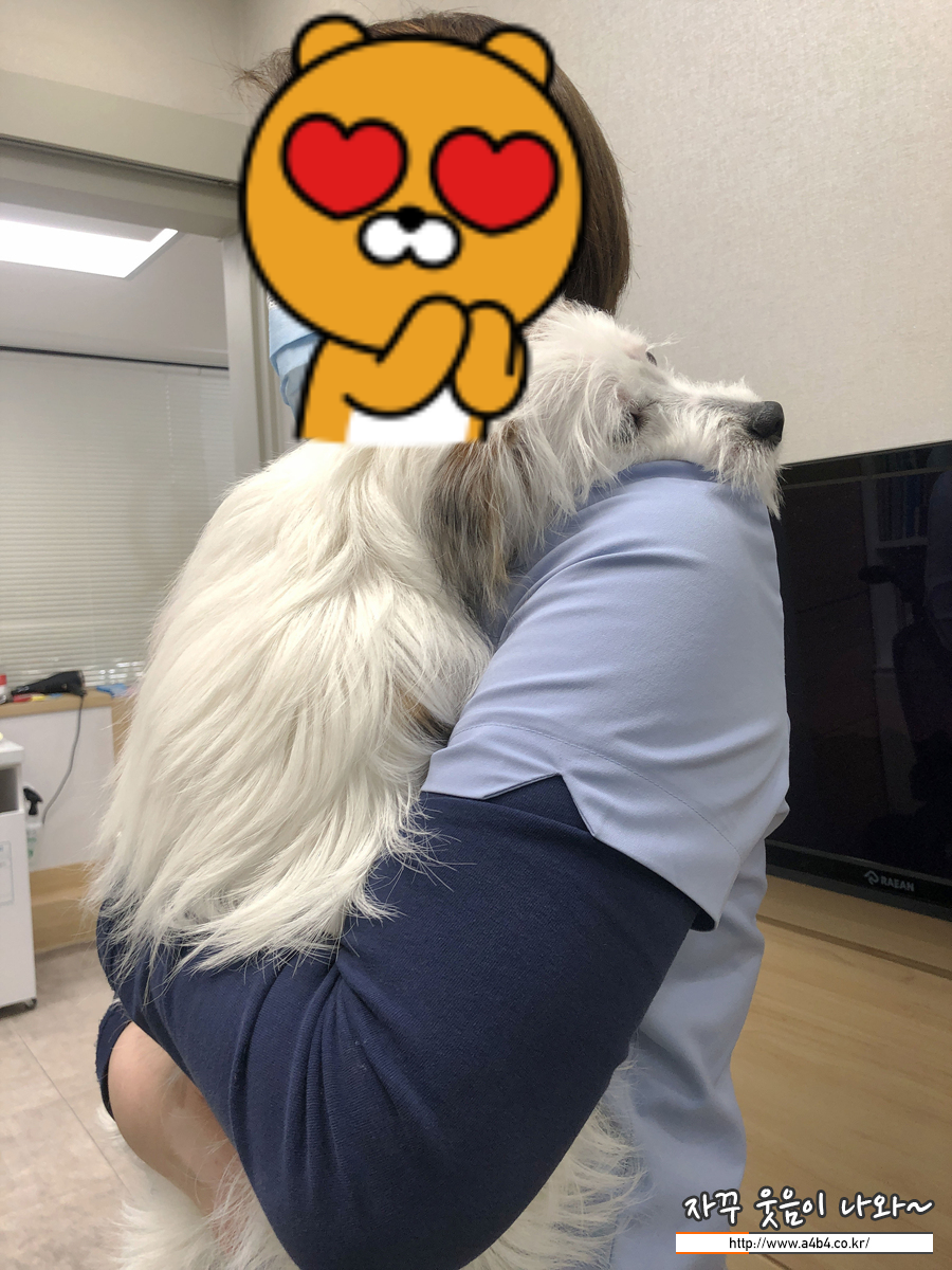 토요일 오전 10시 설탕이가 다니는 동물 병원에 왔습니다. 설탕이가 좋아하는 간호사님께 꼭 안긴 설탕이