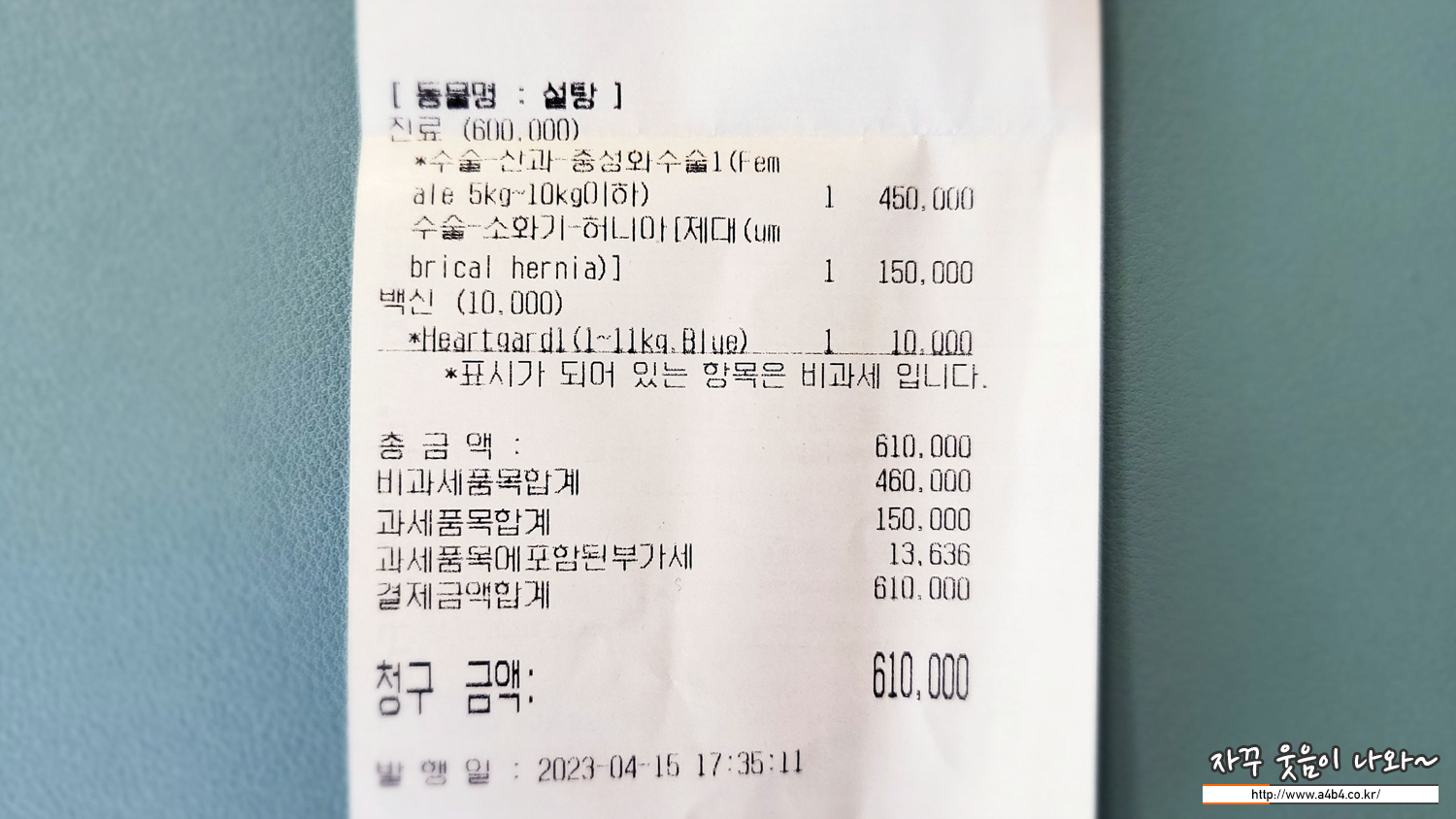 비용은 총 60만원 들었습니다.  강아지 중성화수술 비용은 45만원, 탈장수술 비용은 15만원. 아마도 각각 수술했다면 비용이 더 나왔을 것 같은데요. 의료보험이 없으니 강아지 중성화수술 비용부담이 만만치 않네요.