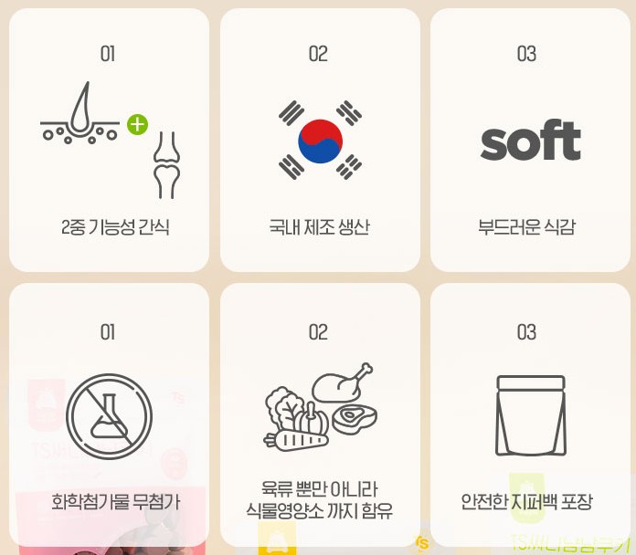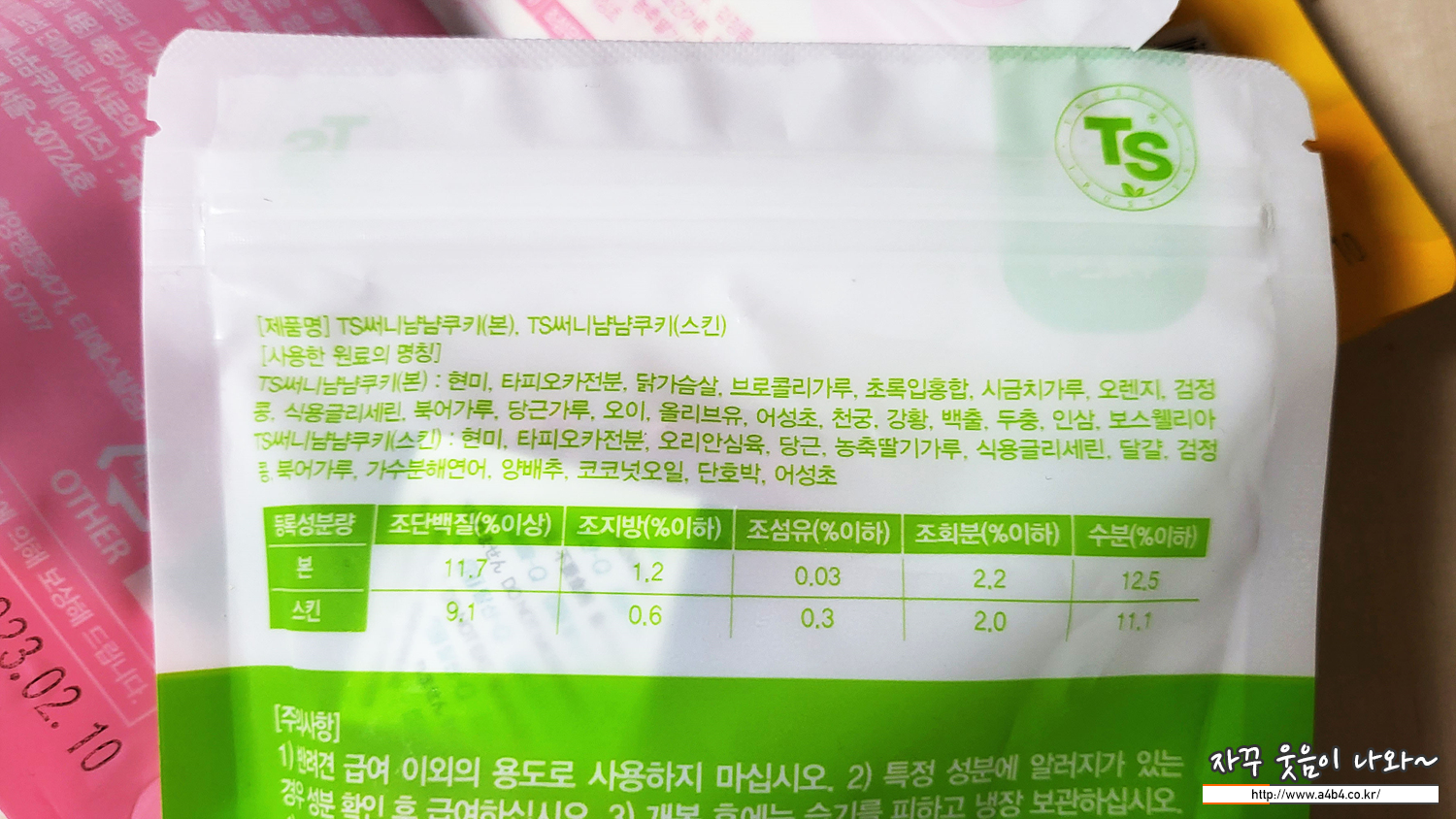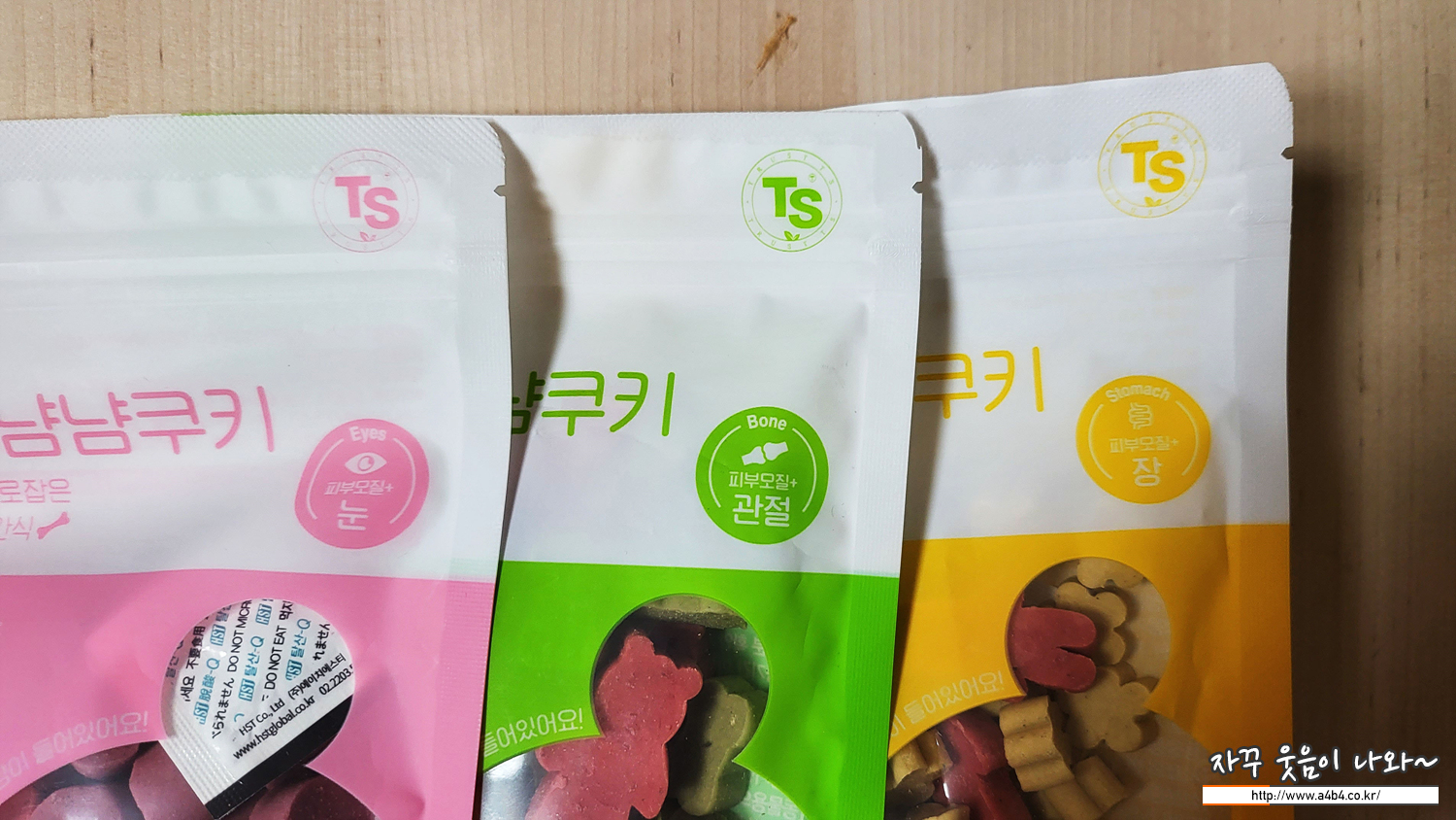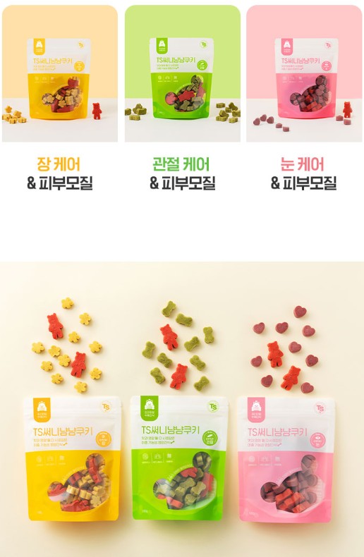 TS써니 냠냠쿠키는 공통으로 강아지의 피부모질을 개선하고 노란색 패키지는 장케어, 초록색 패키지는 관절 케어, 핑크색 페키지는 눈케어에 도움되는 간식이라고 합니다.