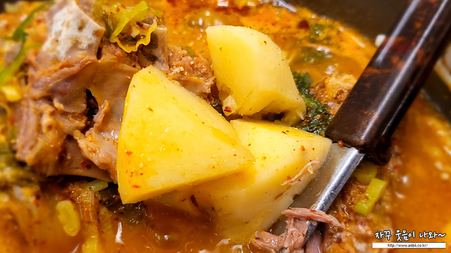 라면에 있는 기름기도 싹 빠지고 적당하게 삶아진 면을 감자탕에 넣으시 기존 감자탕 국물 맛이 잘 유지되면서도 바로 면에 국물이 스며듭니다. 역시나 순식간에 후르륵...