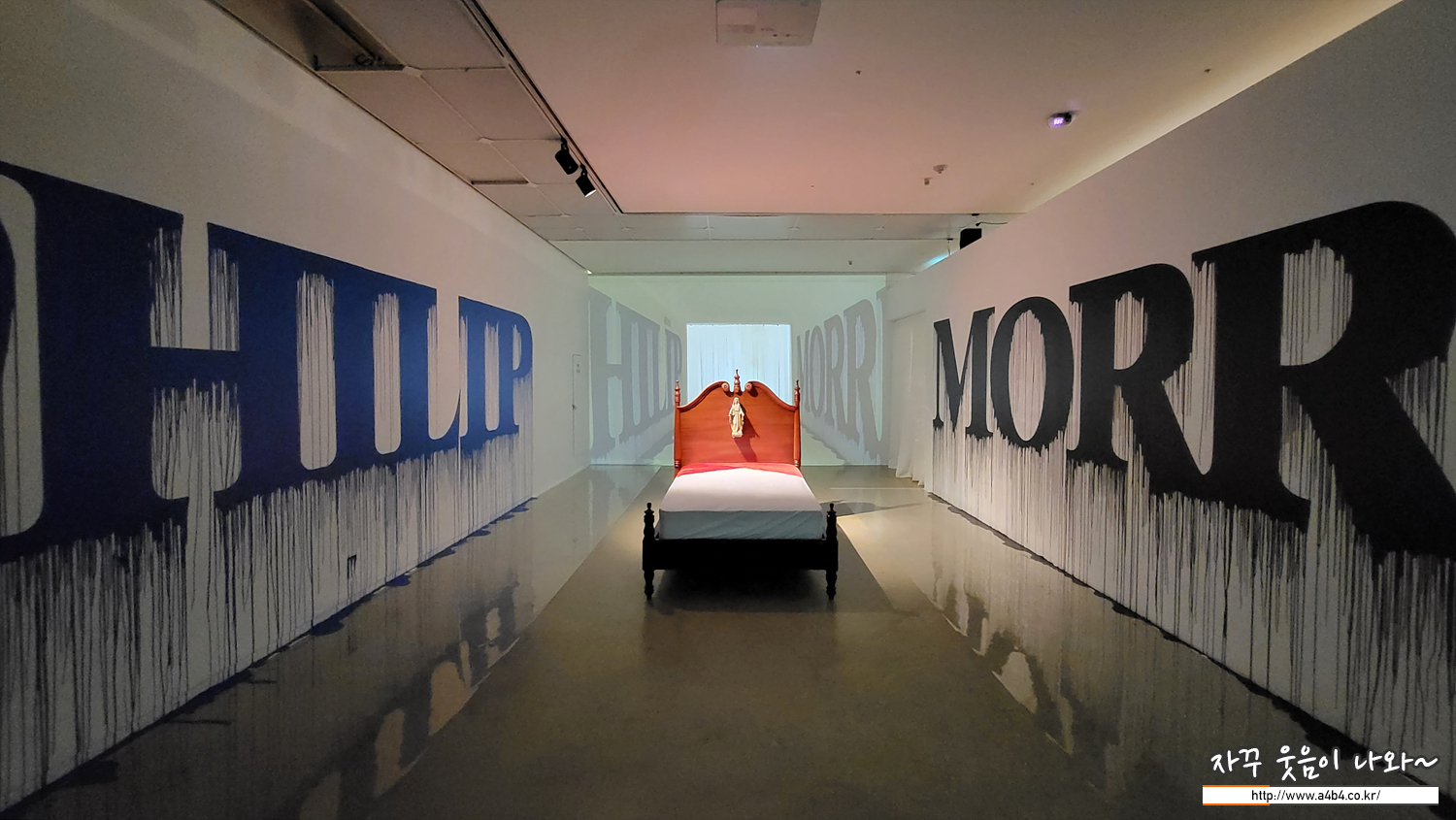 이번 Room 711 전시회의 마지막공간 - 침대의 뒷부분과 흘러내리는 필립모리스 로고가 보입니다.