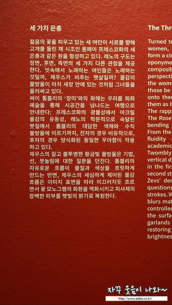 싸이 톰블리의 '장미'와의 화해는 우리를 회화 예술을 통해 시공간을 넘나드는 여행으로 안내한다: 프레스코화의 광물성에서 아크릴 물감의 유동성, 레노의 학문적으로 숙달된 붓질에서 통블리의 대담한 색채와 수직 물방울에 이르기까지, 전자의 경우 비유적으로, 후자의 경우 양식화된 동일한 우아함이 작용 하고 있다.