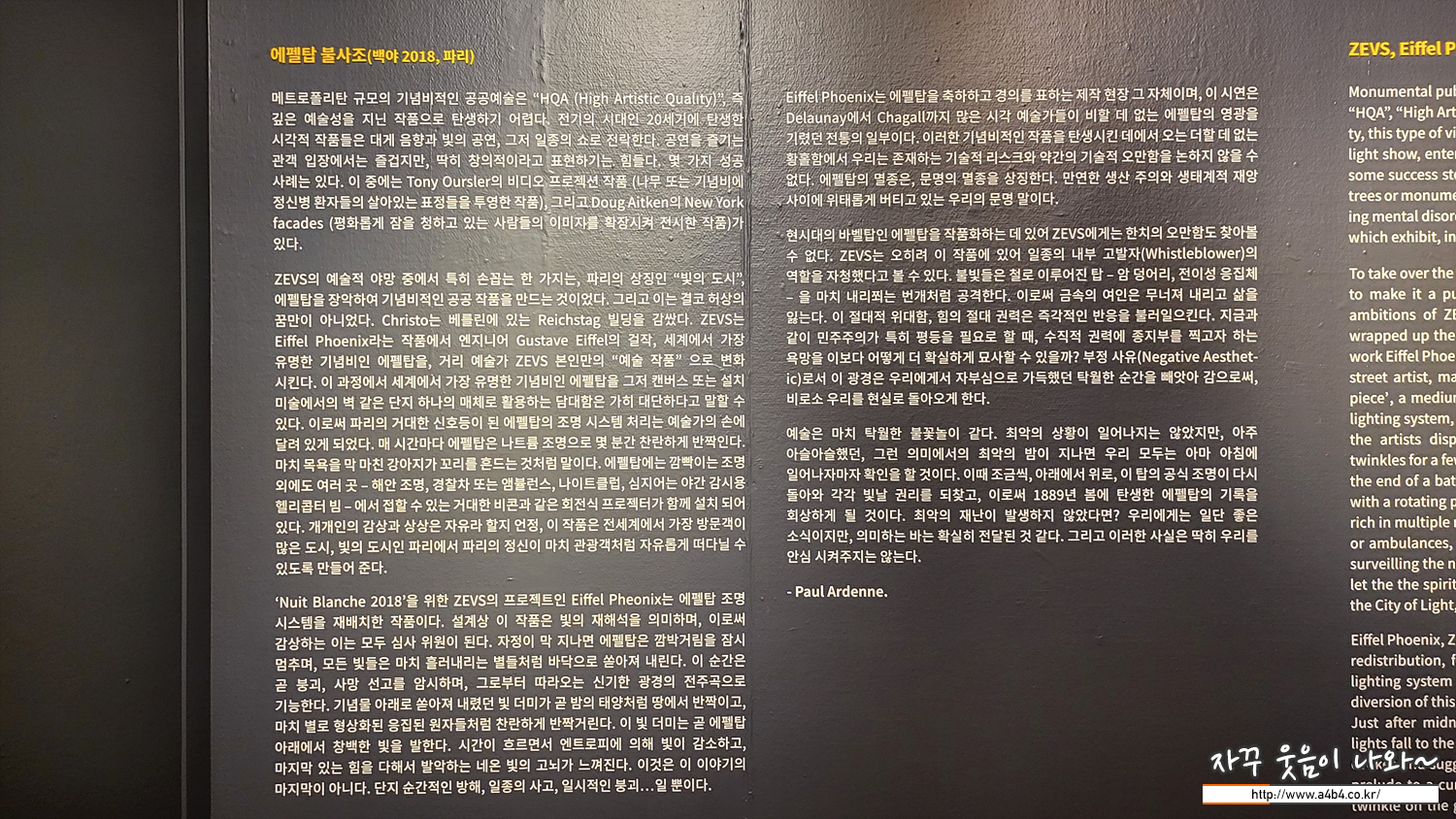 제우스는 2018년 프랑스 파리 백야의 날 행사에 프랑스 대표 작가로 선정되어 에펠탑에 기념비적인 공공작품을 만들었다고 합니다. 그의 작품을 영상으로 만나볼 수 있는 공간입니다.