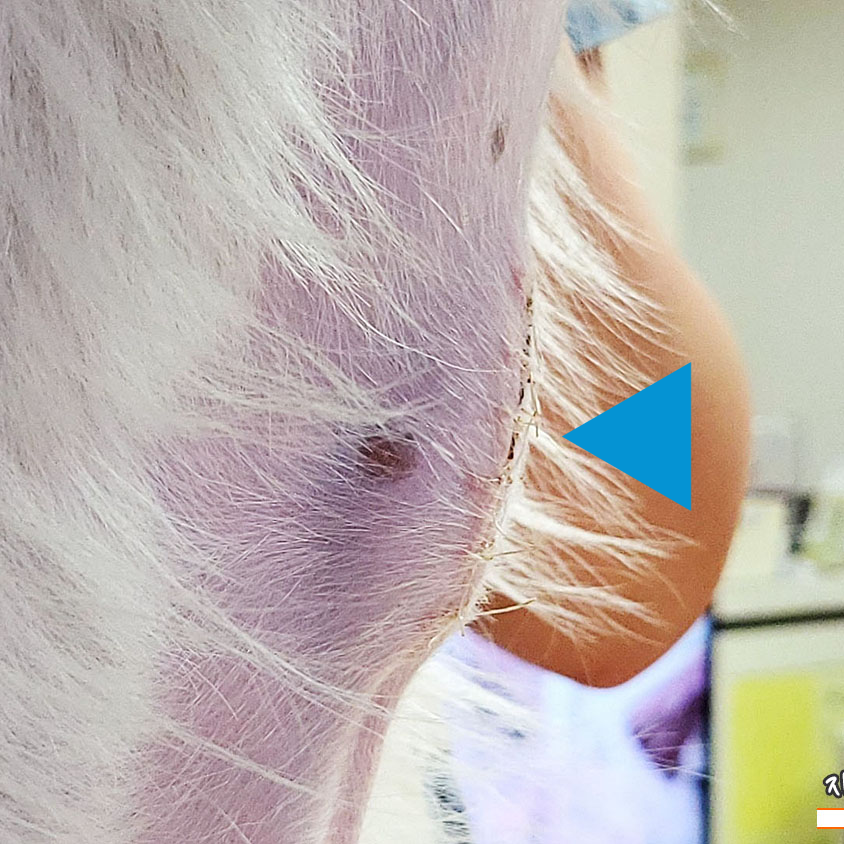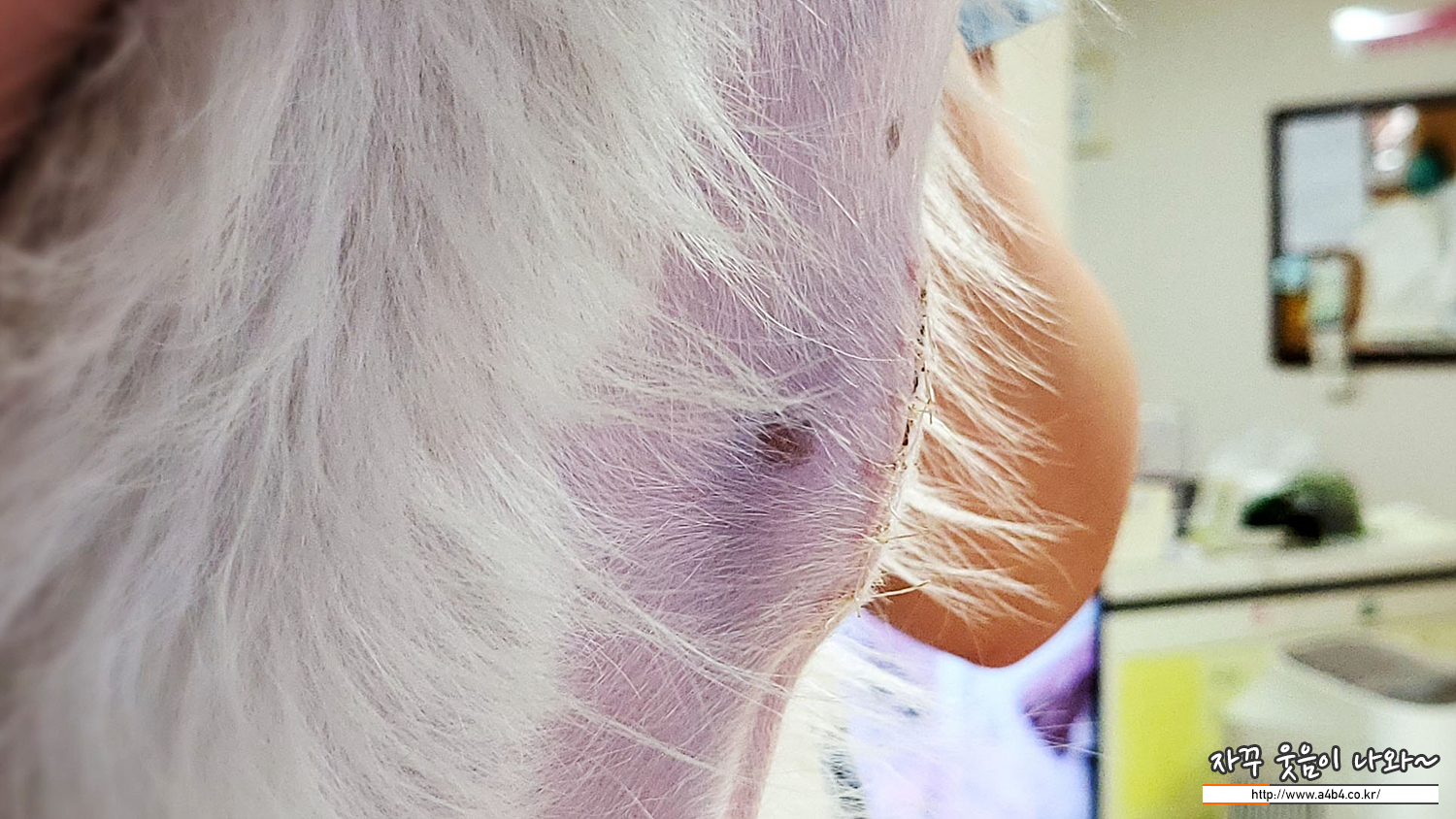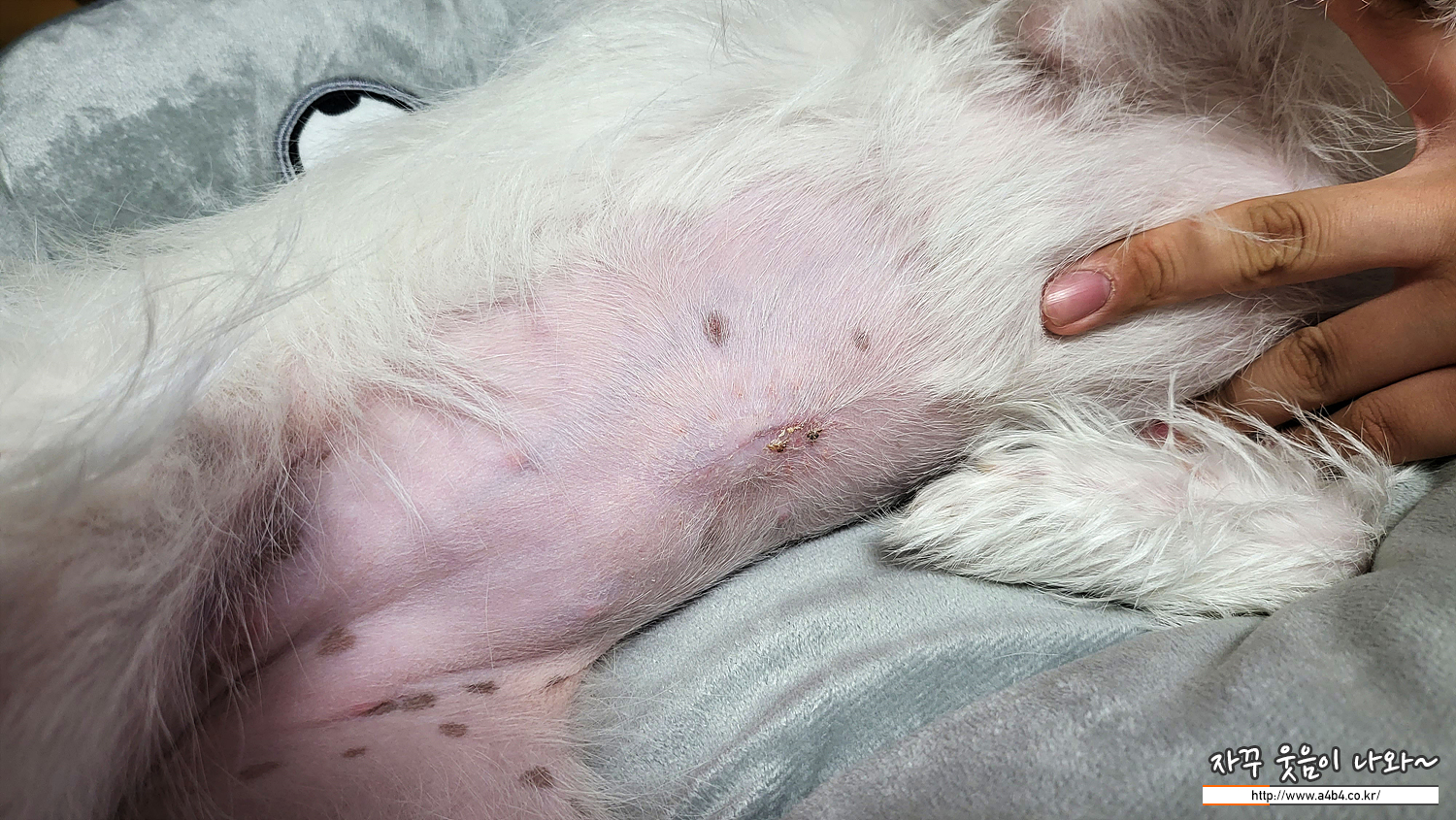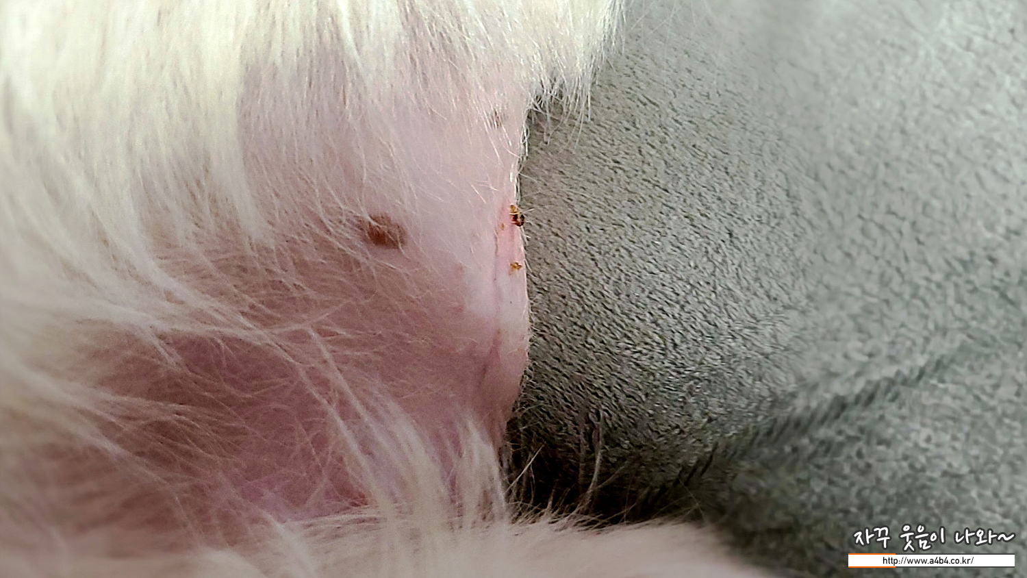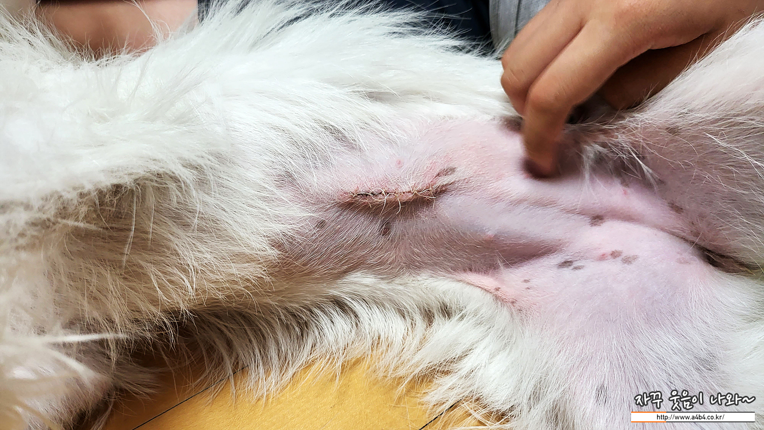 워낙 활발한 녀석이어서 그런지 수술 당일 저녁에 바로 붕대가 풀렸습니다. 수술 후 봉합한 자리가 생각보다 큽니다.