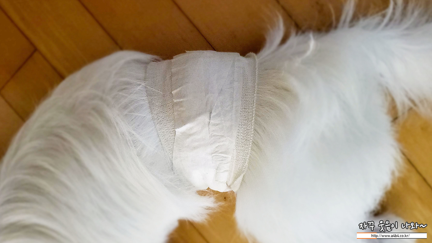 강아지 중성화 수술후 주의사항은 우선 수술한 부분이 감염되지 않는 것입니다. 그래서 첫날에는 이렇게 수술 부위에 붕대를 감아 주는데요. 하루 정도는 붕대로 감싸고 있는 것을 추천해 주셨습니다만...