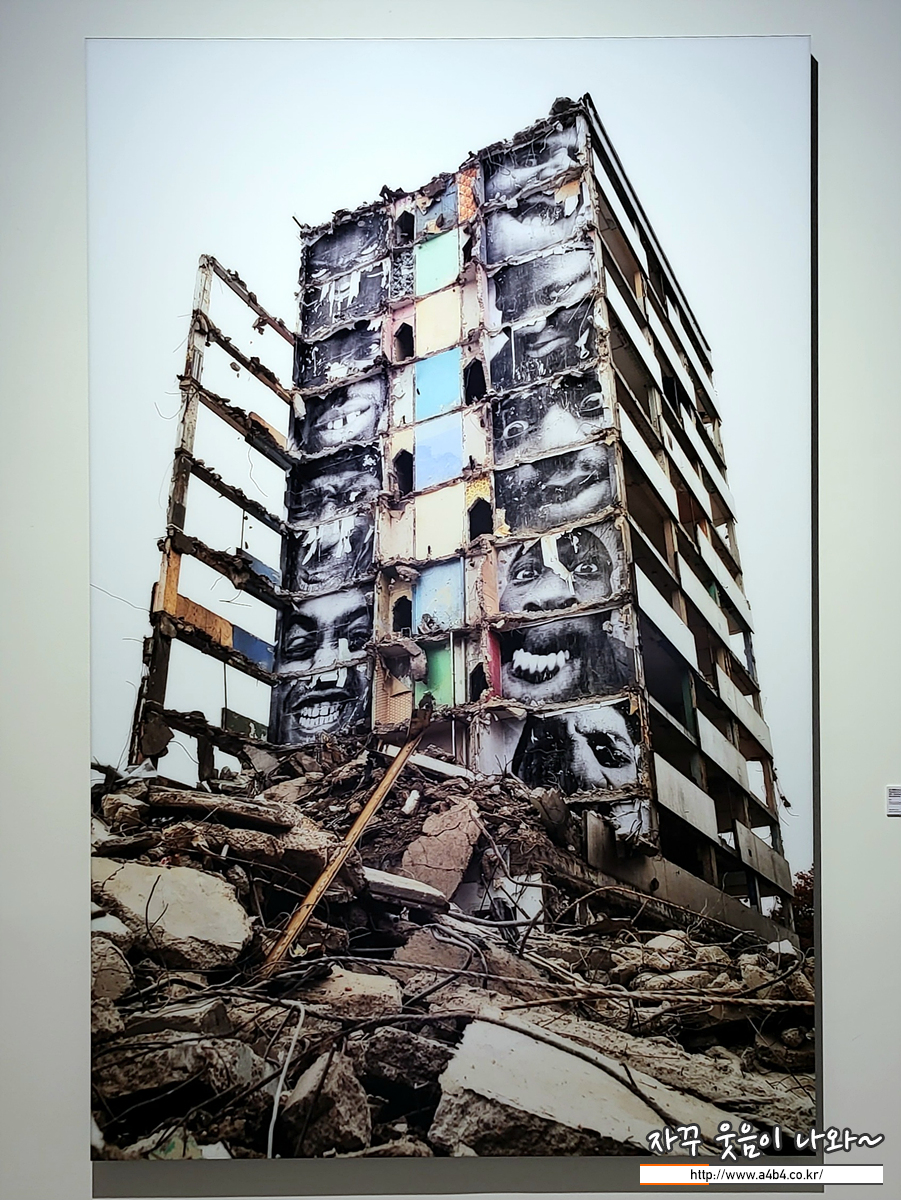 철거 중인 것으로 보이는 사진 속 건물은 제이알과 친구들이 처음 건물에 사진을 붙인 장소입니다. 소요사태가 일어난 후, 정부 기관에서 레부스케 지역의 건물들을 철거하려 하자, 제이알과 그의 팀은 이곳을 다시 방문합니다. 그들은 <세대의 초상 > 을 진행하던 당시 촬영한 초상사진을 건물 내부에 붙이기로 합니다. 밤마다 건물 안으로 몰래 들어가, 부억에는 눈 사진을, 화장실에는 코를, 거실에는 입을 붙였습니다. 한 번은 작업을 마치고 건물 밖으로 나와서 경찰에게 붙잡혔지만, 경찰은 철거를 앞둔 건물에서 그들이 한참을 머무른 이유에 대해 정확히 알 수는 없었습니다. 철거가 시작되고 크레인이 건물을 조금씩 허물어 갈수록 거대한 얼굴들이 모습을 드러내기 시작했습니다. 이 엄청난 광경은 철거 현장에 있던 지역 주민들만 실제로 목격할 수 있었습니다.