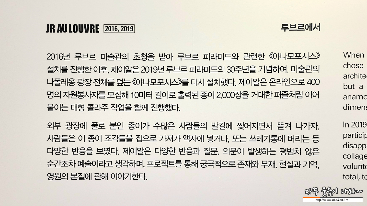 2016년 루브르 미술관의 초청을 받아 피라미드에 설치를 진행한 이후, 제이알은 2019년 루브르 피라미드의 30주년을 기념하여, 미술관의 나폴레옹 광장 전체를 덮는 <아나모포시스> 설치를 다시 한번 선보입니다. 제이알은 2019년에는 온라인으로 400명의 자원봉사자를 모집해 십 미터 길이로 출력된 종이 이천 장을 거대한 퍼즐처럼 이어 붙이는 대형 콜라주 작업을 함께 진행했습니다.