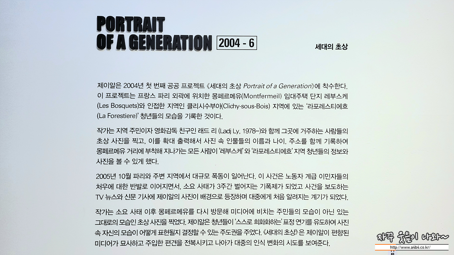 < 세대의 초상 > 에 등장하는 인물들은 파리 교외 지역인 몽페르메유의 주거 단지 '레부스케'와 클리시수부아의 '라포레스티에흐'에 사는 청년들입니다. 제이알의 첫 공공 프로젝트인 < 세대의 초상 ) 은 2005년 파리에서 발생한 소요사태 중 본격적으로 진행됩니다. 2005년 경찰의 검문을 피해 발전소에 숨어든 두 소년이 감전 사고로 사망하는 사건이 발생합니다. 이로 인해 대규모 폭동이 몽페르메유를 포함한 파리 여러 지역에서 발생하면서 후드 티를 입고 얼굴을 가린 청년들이 자동차를 불태우고, 폭력을 행사하는 모습이 뉴스에 나오기 시작합니다.