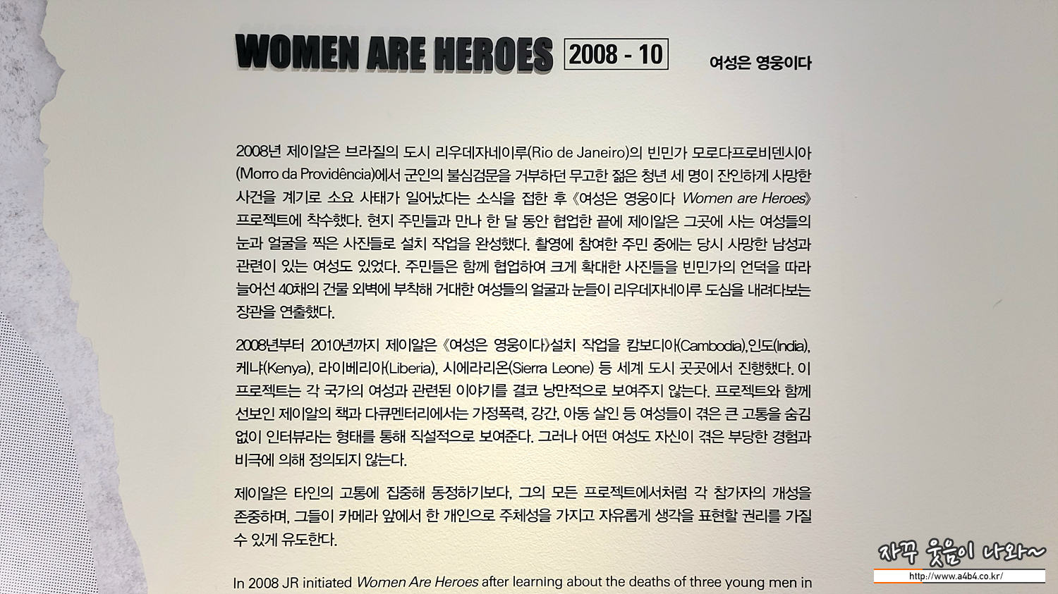 2008년부터 2010년까지 세이알은 장모니아. 인도 케냐 라이베리아 시에라리운 등세계 여러 2008년부터 2010년까지 제이알은 캄보디아, 인도, 케냐, 라이베리아, 시에라리온 등 세계 여러 도시들을 다니며 < 여성은 영웅이다 > 프로젝트를 진행합니다. 이 작업은 가정폭력이나 강간, 아동 살인 등 크나큰 고통 속에 살아온 여성들의 눈과 얼굴을 찍은 사진들을 도시 곳곳에 설치하는 것이었습니다. 2008년 서아프리카 라이베리아로 갑니다. 라이베리아는 내전 직후라 반군이 아주 많았고, 유엔 관계자도 파견되어 있었습니다. 제이알은 친구와 함께 거리를 걷다가 유엔의 통제를 받지 않는 위험할지도 모를 구역에 들어가 작업을 시도합니다. 그 곳에는 부서진 다리가 있었고 다리 한가운데 반군 무리가 지키고 있었습니다. 제이알과 친구는 수상함을 느낀 반군에게 검문을 받게 되었고, 제이알은 다리 옆쪽에 사진을 부착하고 싶다고 말했습니다. 반군은 가능하지만 금전적인 대가를 지불해야 한다고 주장했고, 제이알은 광고가 아니기 때문에 돈을 낼 수 없다며 언쟁을 이어갔습니다.