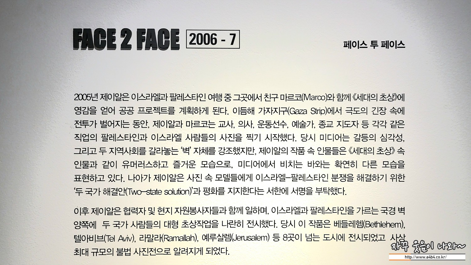 2005년 친구 마르코와 함께 팔레스타인과 이스라엘을 방문한 제이알은 두 번째 공공 프로젝트인 <페이스 투페 이스 > 를 시작합니다. 사진에서는 교사나 의사, 운동선수, 예술가 등 직업을 가진 팔레스타인과 이스라엘 사람들의 얼굴을 보여줍니다. 사람들은 누가 팔레스타인인인지 아니면 이스라엘인인지 쉽게 구분하지 못했지만, 격렬한 교전이 벌어지고 있던 당시 두 지역 사람들은 강한 적대감을 가지고 서로를 다르다고 생각했습니다. 직트.하지만 제이알은 프로젝트를 진행하면서 두 지역 사람들과 가깝게 소통하게 되고 나서, 그들에 대한 고정관념이 서 서히 사라지게 됩니다.