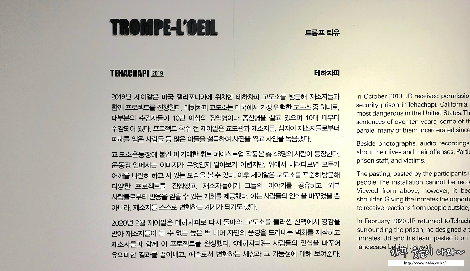 테하차피 교도소는 수많은 담장과 전기 울타리, 방탄조끼를 입은 교도관들이 있는 보안이 엄격하기로 유명한 곳으로, 미국에서 가장 폭력적인 교도소 중 하나로 꼽힙니다. 프로젝트 착수 전에 교도관과 재소자들, 그리고 재소자들로부터 피해를 입은 사람들 등 많은 이들을 설득해서 동의를 구해야 하는 어려운 시간들이 있었지만, 제이알은 포기하지 않았고 재소자들 각자의 사진을 찍고 그들의 사연을 녹음했습니다. 이후 제이알은 뉴욕으로 돌아가 2주동안 스튜디오에서 338장의 사진을 출력했고, 교도관, 재소자들 모두가 교도소 운동장에 모여 사진을 함께 붙였습니다.