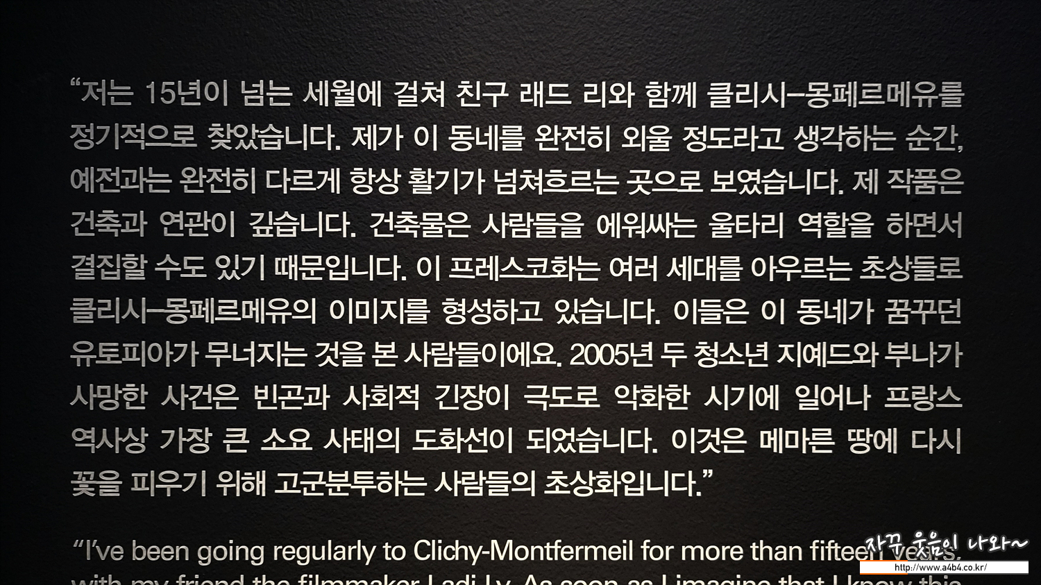 제이알이 최근 진행하고 있는 대형 벽화 프로젝트는 멕시코 아티스트 디에고 리베라의 벽화에서 영감을 받아 시작했습니다. 제이알의 벽화 프로젝트로써 처음 제작된 < 클리시-몽페르메유 연대기 )는 과거 <세대의 초상>을 진행했던 프랑스 클리시-몽페르메유 지역에 대한 이야기 입니다.