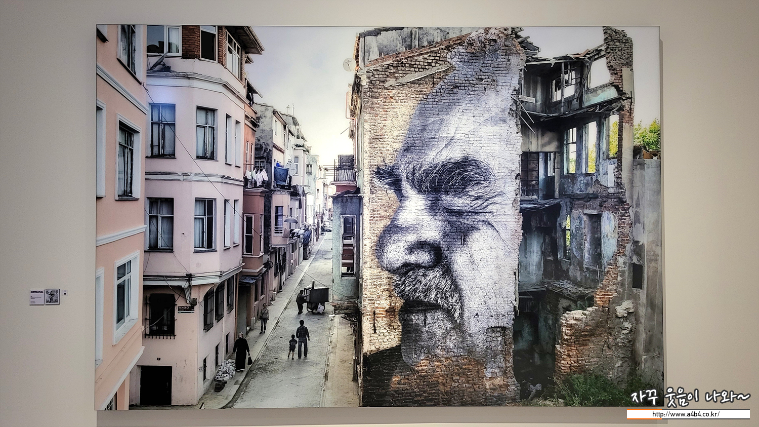 도시에는 각기 다른 시기에 지어진 건물들이 공존합니다. 오래된 건물이 사라지고 새로운 건물이 들어서기도 하고, 동시에 금이 간 오래된 건물이 있기도 합니다. 제이알은 이런 복잡성을 지닌 도시를 배경으로 삼아 < 도시의 주름 > 프로젝트를 시작합니다. 튀르키에 이스탄불은 오래된 건물과 세월의 흔적을 보여주는 주름을 가진 노인이 많이 살고 있었기에 제이알에게 프로젝트를 진행하기 더없이 좋은 도시였습니다. 제이알은 가는 곳마다 거리에서 만나는 사람에게 작업에 참여해 줄 수 있는지 묻고, 도시의 역사를 겪은 주름이 많은 노인을 아는지 확인했습니다. 그다음 도시 곳곳을 누비며 사진을 불일 건물을 찾고, 그 곳을 사용하기 위해 건물주의 동의를 구했습니다. 건물의 뒤쪽이 무너져 마치 머리 뒷부분이 생략된 것처럼 보이는 남성 사진이 붙어있는 건물 역시 주인에게는 허락을 받았지만, 시에서는 허락해주지 않아 제이알은 늘 그렇듯 허가없이 작업을 이어 나갔습니다.