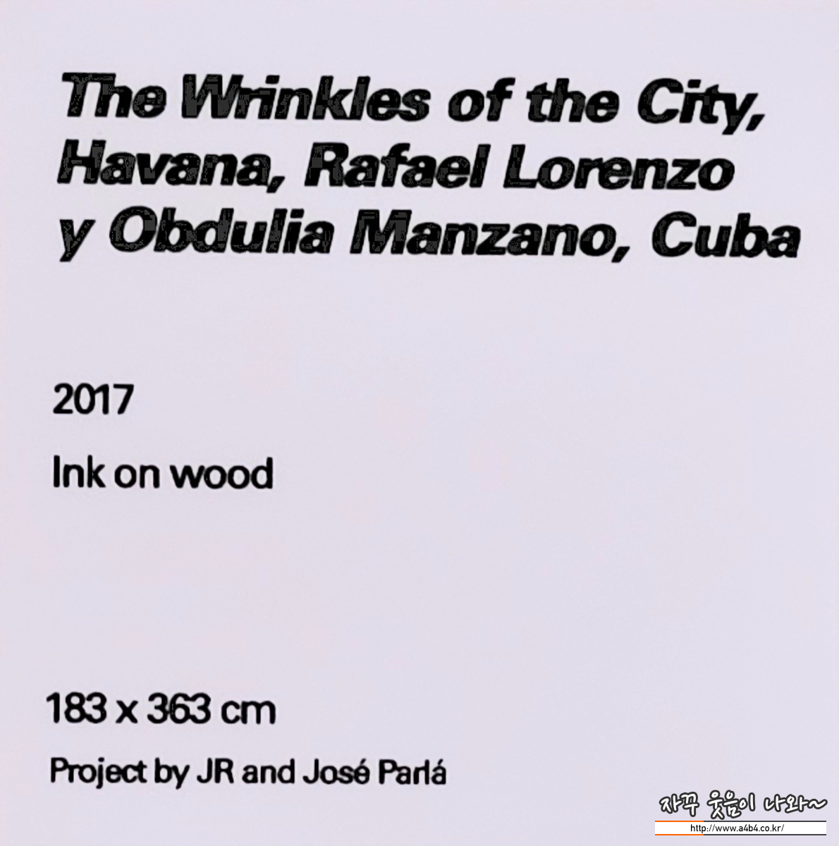 <도시의 주름, 하바나>는 쿠바의 수도이자 주요 항구 도시인 하바나에서 진행했습니다. 쿠바 주민들은 피델 카스트로나 체 게바라 같은 정치 혁명가가 그려진 벽화만 접해 왔기 때문에 제이알은 거리에 평범한 사람들의 얼굴을 전시하기로 합니다. 제이알은 쿠바계 미국인 아티스트인 친구 호세 팔라와 함께 도시의 역사를 지켜본 노인을 찾아서 사연을 듣고, 그들의 사진을 하바나의 무너져 가는 건물 벽에 불였습니다. 이 작품에는 사랑스러운 노부부 한 쌍이등장합니다.
