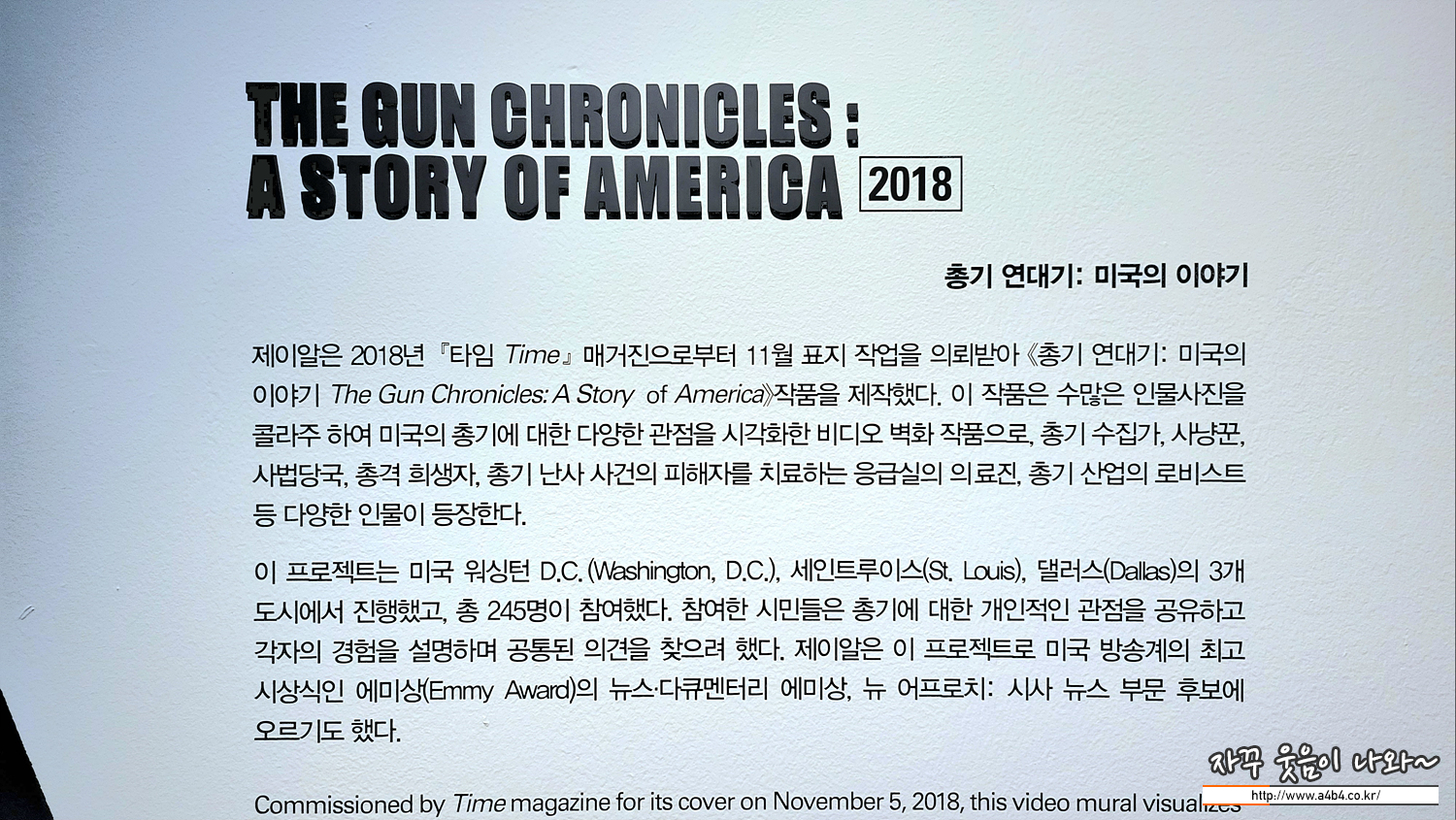 < 총기 연대기: 미국의 이야기 ) 는 미국의 총기 사용에 대한 다양한 관점을 시각화한 비디오 벽화입니다. <클리시-몽페르메유 연대기 ) 의 영향력을 몸소 느낀 제이알은 이 작품에서 참여자들의 모습뿐만 아니라 그들의 목소리를 담은 영상을 제작하기로 합니다. 마침 작가는 2018년 11월 [타임 지 표지 디자인을 의뢰 받으면서, 미국 총기 사건을 주제로 작업을 시도 해보기로 합니다. 사람들이 원탁에 모여 토론을 벌이는 장면을 상상하며, 총기 수집가, 사냥꾼, 경찰, 총격 희생자, 총기 난사 사건의 피해자를 치료하는 의료진, 총기 산업의 로비스트 등 여러 이해관계에 업힌 사람이 함께 등장하는 장면을 기획합니다. 제이알은 미국 전역을 돌아다니며 참여자를 찾았고, 이들은 각자의 사연을 공유하고 총기에 대한 개인적인 의견을 이야기했습니다. 마침내 250명의 사람들이 토론에 참여하고 있는 듯한 모습을 연출한 < 총기 연대기: 미국의 이야기 > 가 완성되어, 미국 전역에서 전시되었습니다.
