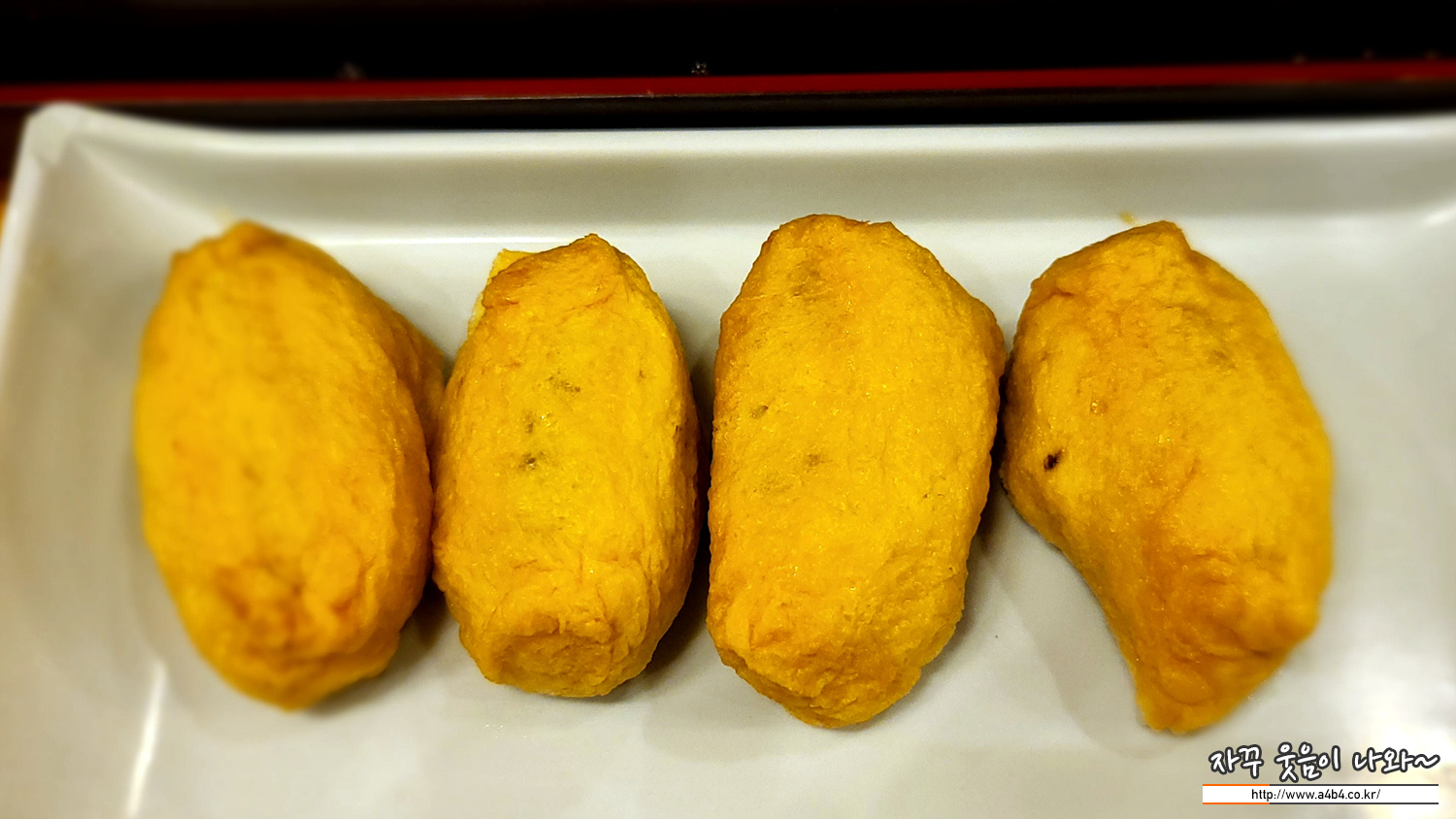 모밀국수와 같이 나오는 유부초밥 4조각입니다. 정식이어서 돈까스 한 조각 나오는 줄 알았는데... 그건 아니군요.