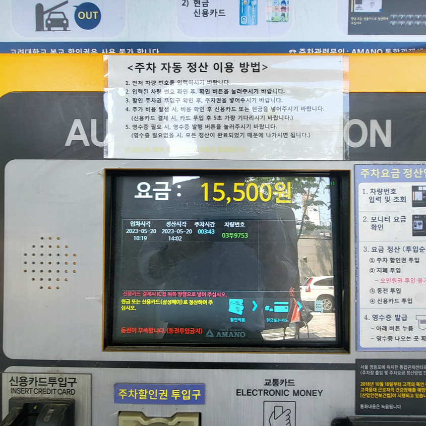 예식장 주차요금은 아래와 같이 초기 두 시간은 10분에 500원 이후에는 10분 당 1천원의 주차요금이 청구됩니다. 결혼식 하객은 2시간 무료 주차권을 받을 수 있고요. 저는 조금 일찍와서 고려대학교 박물관에서 열리고 있는 박물관 개관 50주년 전시회 '지천명에 화답하다' 전시회를 관람했더니 주차 시간이 3시간 43분이 소요 되었네요. 청구 요금은 15,500원이 나왔고요. 2시간 할인 받고 주차요금이 11,000원 나왔습니다. (계산 방식이 약간 이해가...)