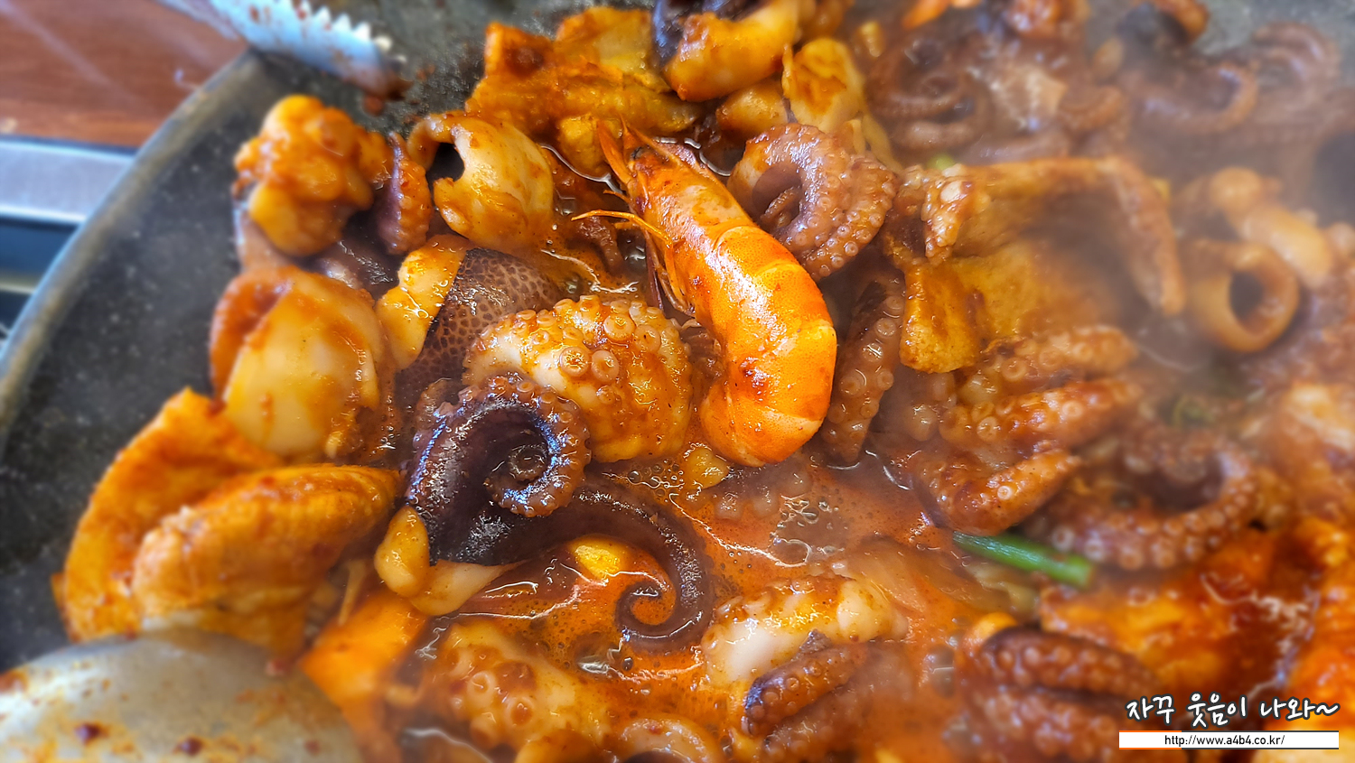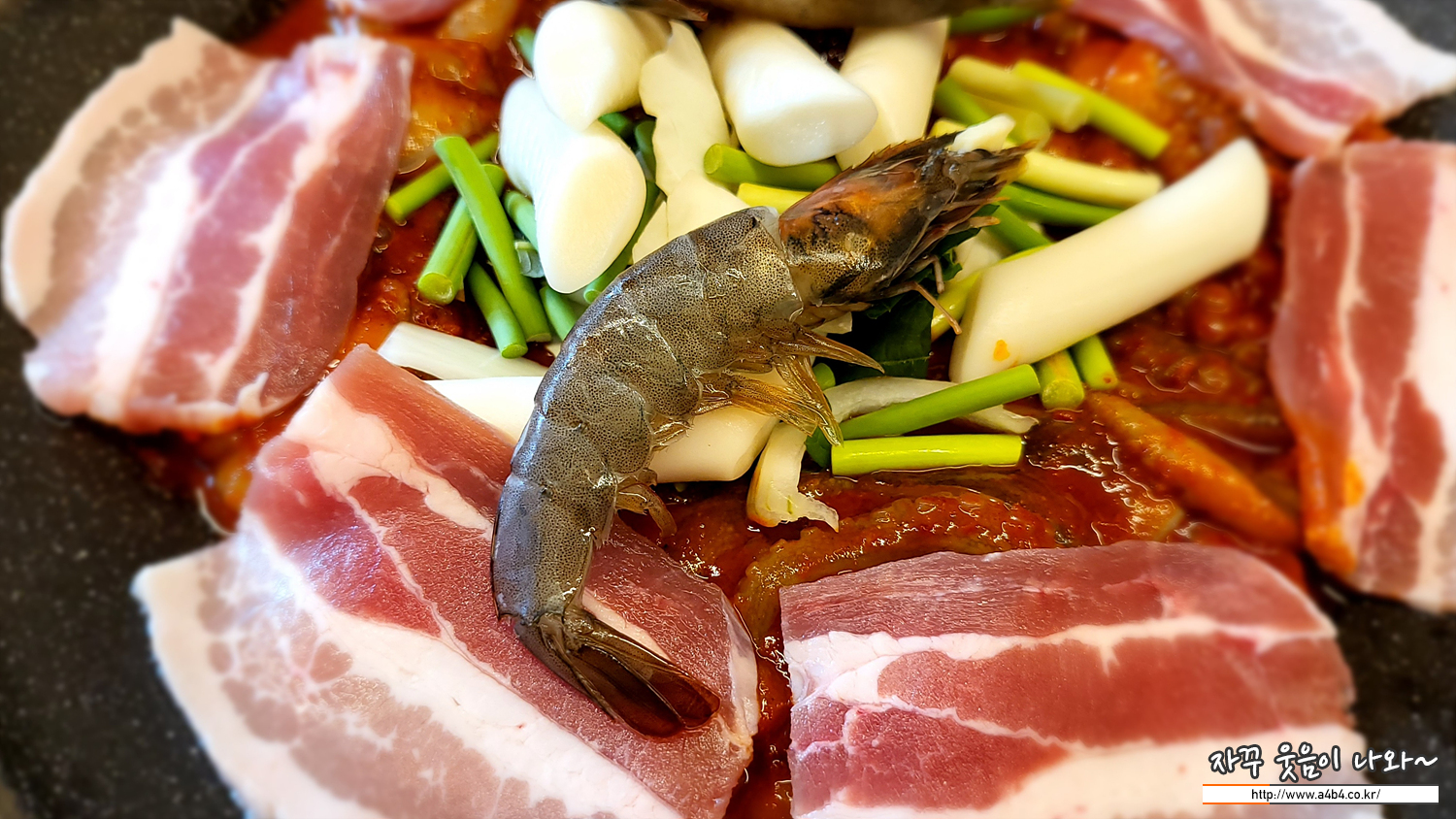 이렇게 불판 아래에는 양념 쭈꾸미가, 그 위에는 삼겹살과 새우, 떡과 마늘쫑이 올라갑니다. 새우는 3마리가 올라갔는데요. 아마도 쭈새우 1인 분에 새우 3마리가 기본으로 보입니다.