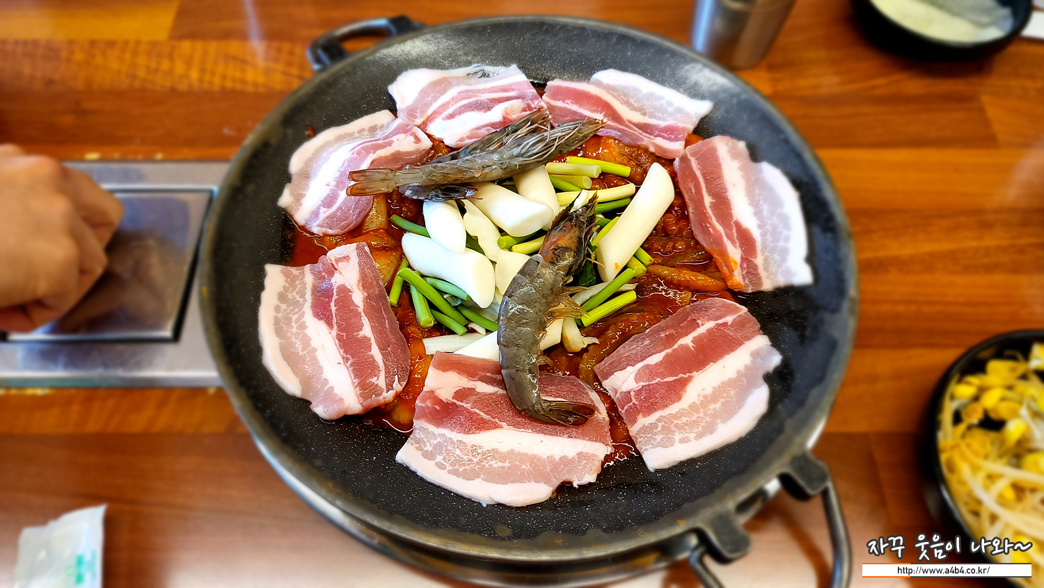 이렇게 불판 아래에는 양념 쭈꾸미가, 그 위에는 삼겹살과 새우, 떡과 마늘쫑이 올라갑니다. 새우는 3마리가 올라갔는데요. 아마도 쭈새우 1인 분에 새우 3마리가 기본으로 보입니다.