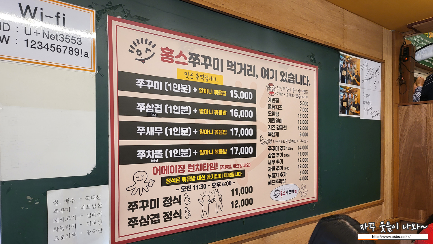 메뉴는 크게 4가지가 있습니다 쭈꾸미와 함께 알마니 볶음밥이 나오는 것은 기본이고요. 기본 메뉴는 1인 분에 1.5만 원입니다. 여기에 삼겹살이 들어간 쭈삼겹은 1.6만 원, 새우가 들어간 쭈새우는 1.7만 원, 쭈차돌은 1.7만 원 입니다.