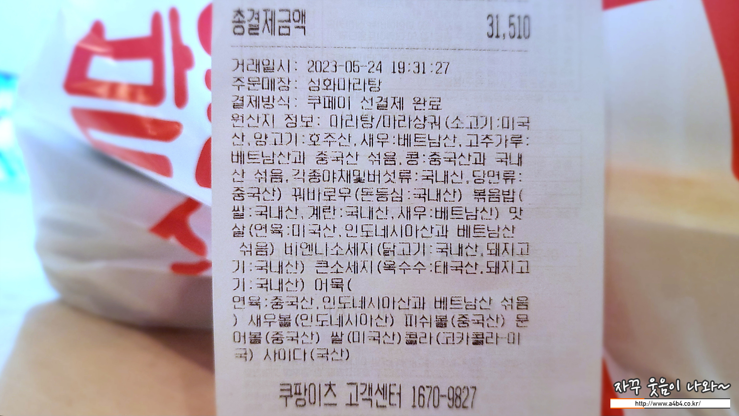 가격은 배달비 (프로모션 있어 0원)용 포함해서 31,510원에 주문 했네요. 보통 집까지 배달에는 30분 정도 소요됩니다.