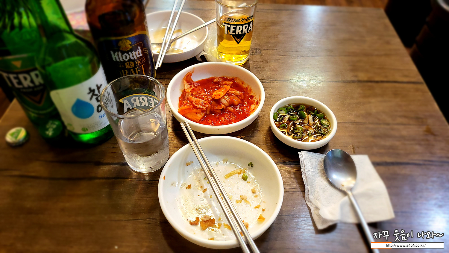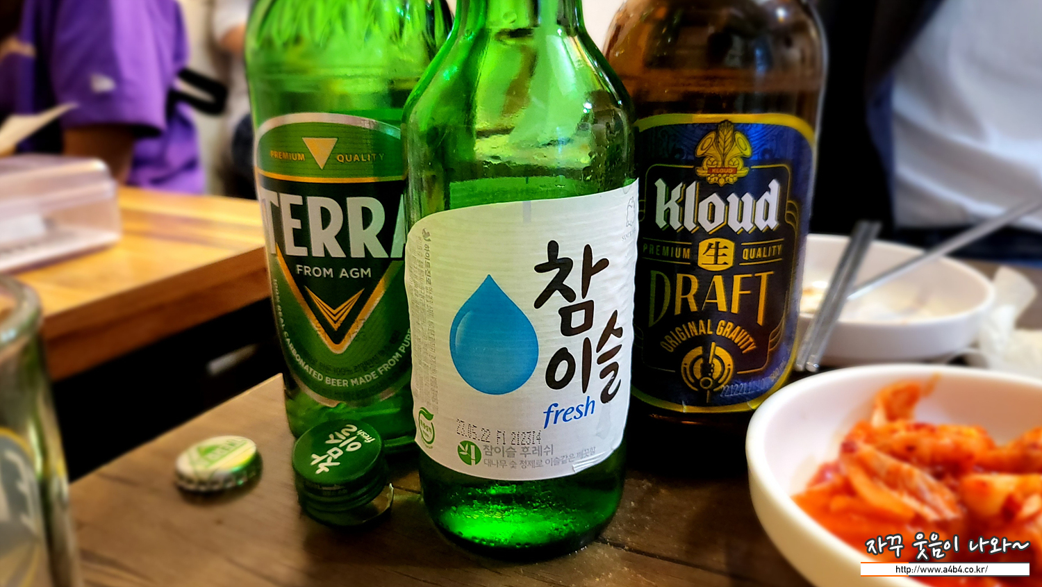 워낙 바쁜 곳이어서 알아서 냉장고에서 가져다가 먹으라고 하시네요. 맥주 한 변으로 시작했는데. 한 시간만에 이렇게 끝났다는... 소주 맥주 가격은 병당 5,000원 입니다.