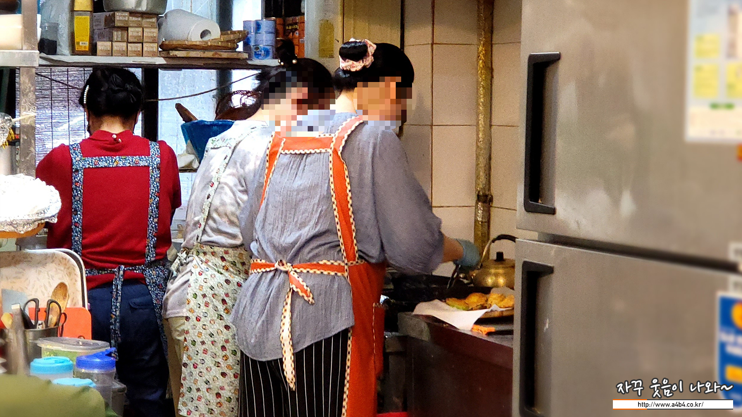 모듬전 맛집에 왔으니 전을 주문해야죠. 저희는 나루모듬전 절반 사이즈인 미니모듬전과 조금 있다 골뱅이소면 주문했습니다. 이모님 세 분께서 쉬지 않고 전을 만들고 있으십니다.