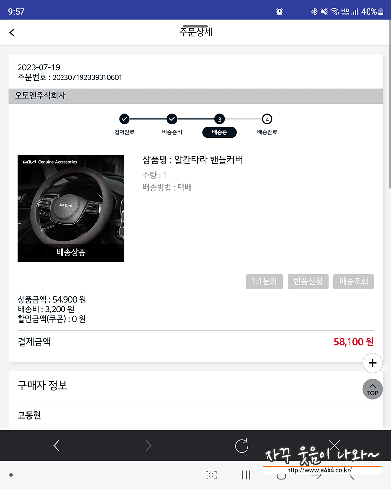 기아자동차 공식몰에서 구입했으며, 제조사는 오토앤 제품명은 알칸타라 핸들커버 입니다. 알칸타라 핸들커버 가격은 54,900원에 배송비 3,200원 포함 총 58,100원 입니다. 일반 온라인 쇼핑몰보다는 가격이 다소 높지만, 기아 레드맴버스 포인트도 있고, 이곳 기아 제뉴인 액세서리 몰에서만 구입할 수 있는 디자인 특징도 있습니다.