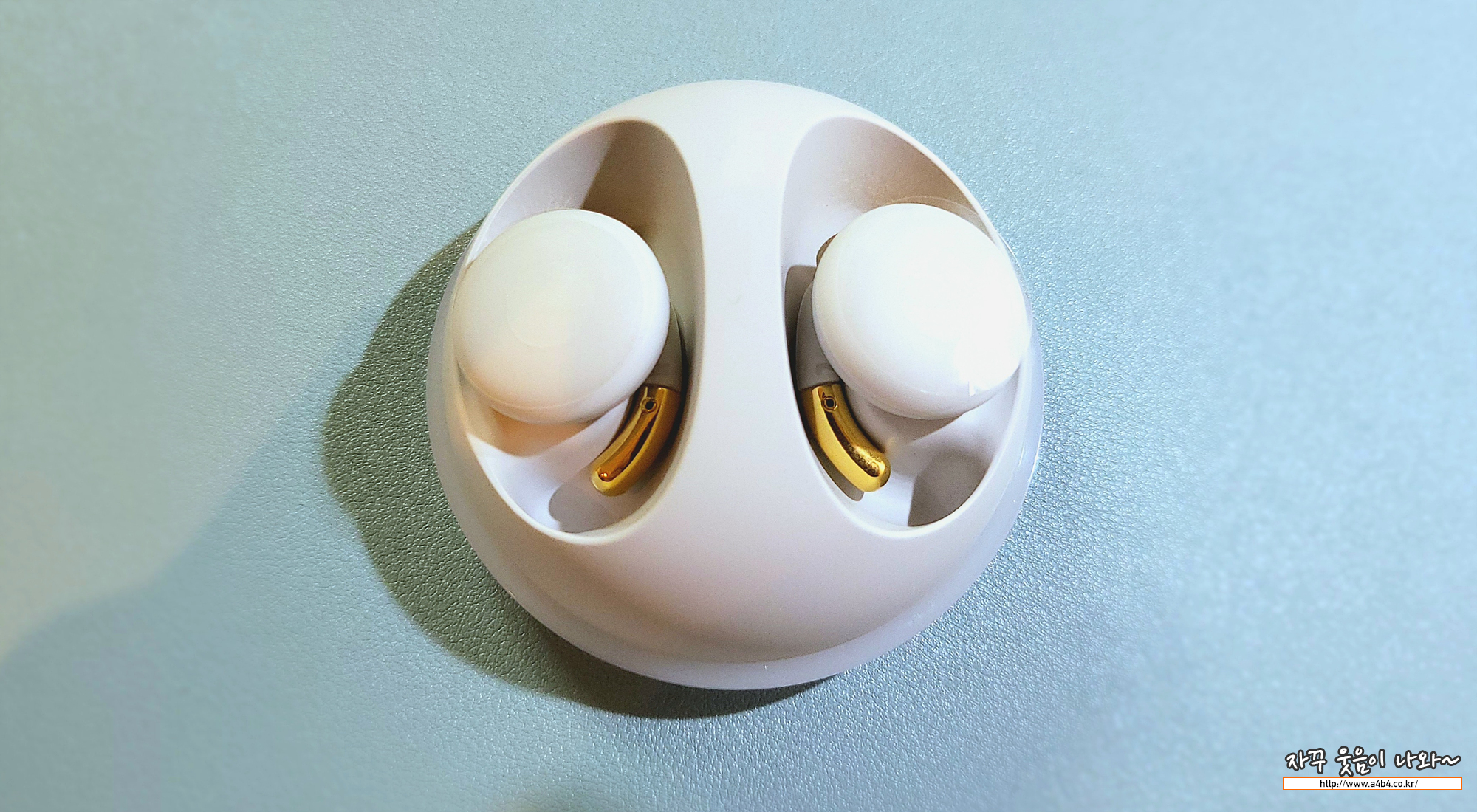 브리즈 박스를 개봉하면 안에는 지름 8cm 정도의 둥근 크래들이 먼저 보이네요. 기대보다는 상당히 큰 크기에 다소 움찔? 합니다. 에어팟 프로2와 비교해 보시면 대략적인 크기를 느끼실 수 있습니다.