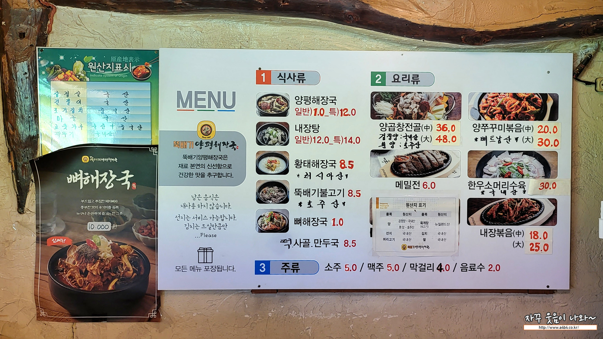 메인 메뉴는 양평해장국입니다. 가격은 일반 10,000원 / 특 12,000원, 이외에도 내장탕, 황태해장국, 뚝배기불고기, 뼈해장국, 사골 만두국 등의 식사메뉴가 있으며 가격은 8,500원 부터 14,000원 사이입니다. 이외에 양곱창전골, 양쭈꾸미볶음, 소머리수육 등의 요리류와 주류가 준비되어 있습니다.