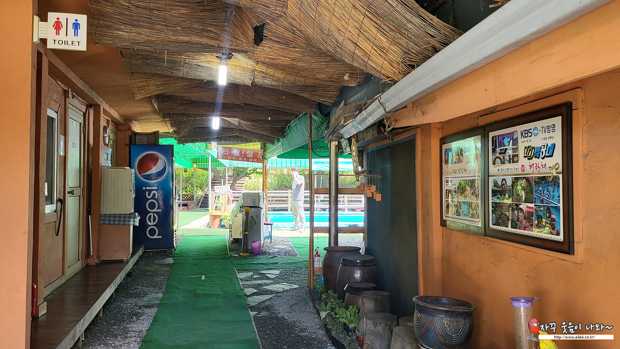 실내 모습입니다. 옛날 집 모양의 실내와 안쪽에는 두 개의 수영장이 자리잡고 있습니다. 과거 블로거 포스팅을 보면 여름에 수영장에 물이 차 있었는데요. 이번 여름 시즌에는 수영장이 운영 안하는 것 같습니다.그냥 텅 빈 수영장