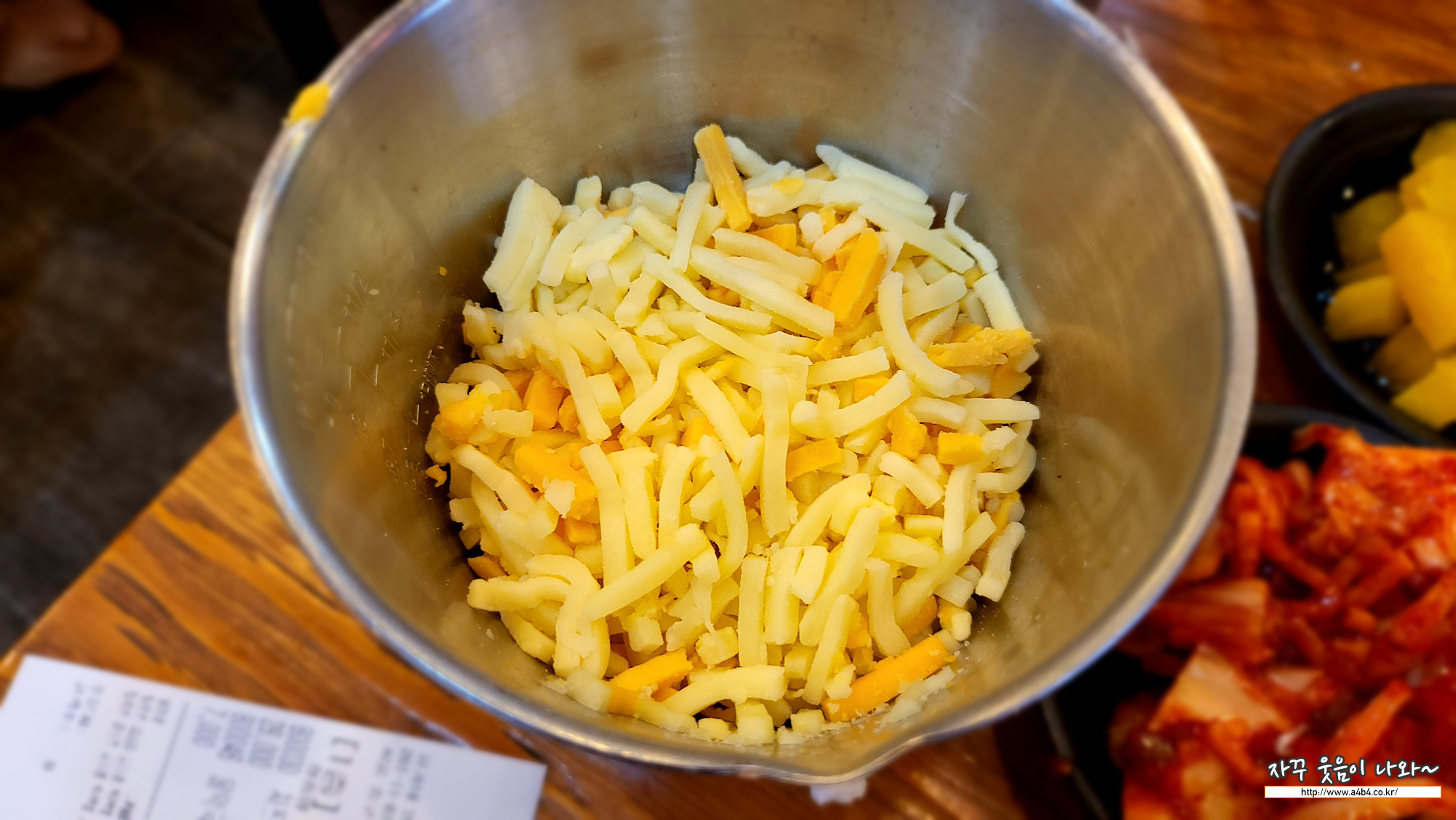 닭갈비가 다 익으면 이렇게 불판 주위로 치즈를 올립니다.