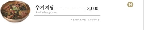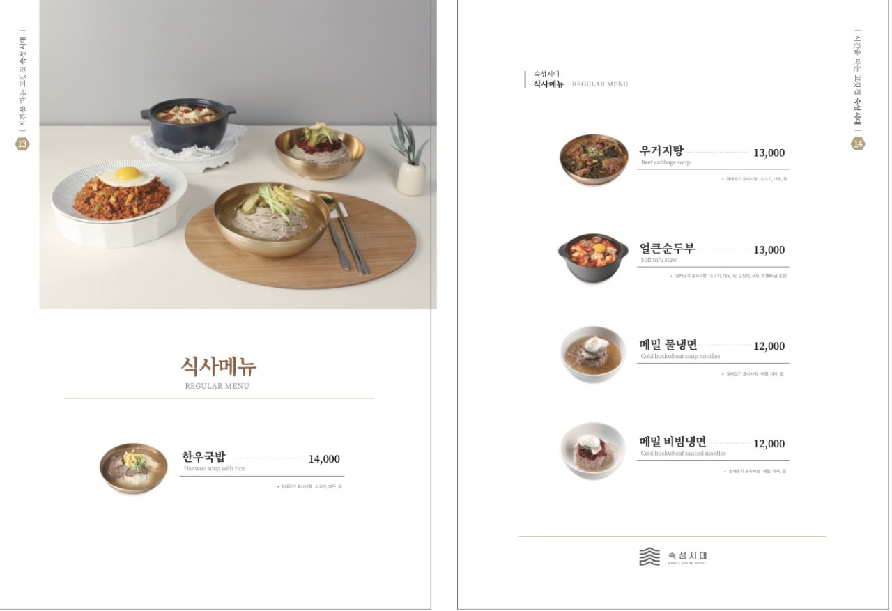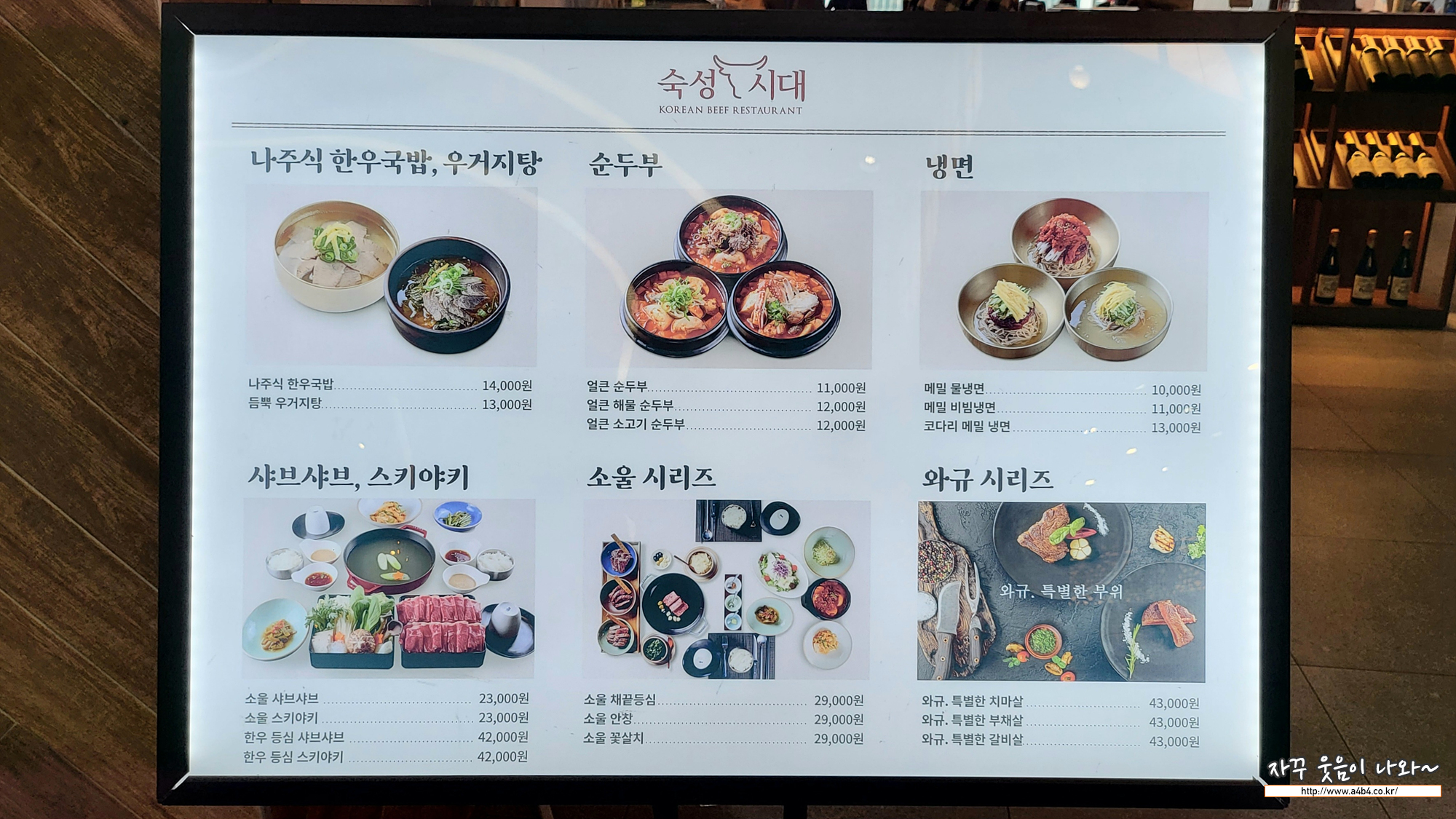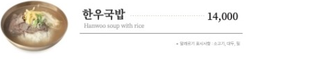 일반 식사류로는 한우국밥, 우거지탕, 순두부, 냉면등이 준비되어 있습니다. 가격은 1만원 초반 부터 중반,