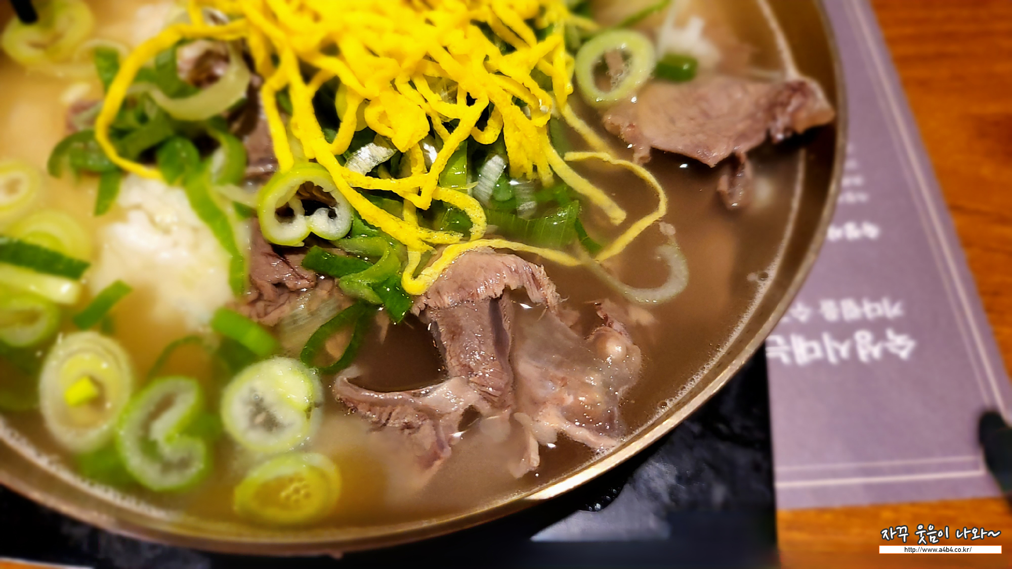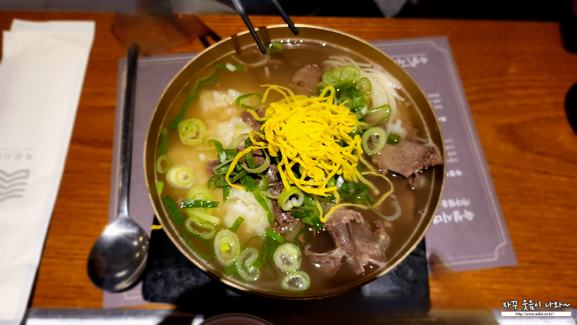 두껍고 무게감이 있는 놋그릇에 나오는 나주식 한우곰탕입니다. 이곳 숙성시대 롯데월드몰점의 대푠 식사메뉴이기도 합니다. 고기도 질기지 않고 많이 나오고요. 국물도 맑고 진한 맛을 보입니다.