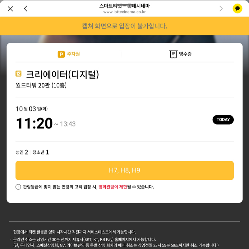 조금 늦게 예약해서 저는 한 줄 앞인 H열 7번 8번 9번 좌석을 예약 했는데요. 사진은 H열 10번 좌석에서 촬영했습니다. 롯데시네마 월드타워 20관 명당자리는 아니지만 그럭저럭 영화 감상하기에 큰 무리 없었던 자리입니다.