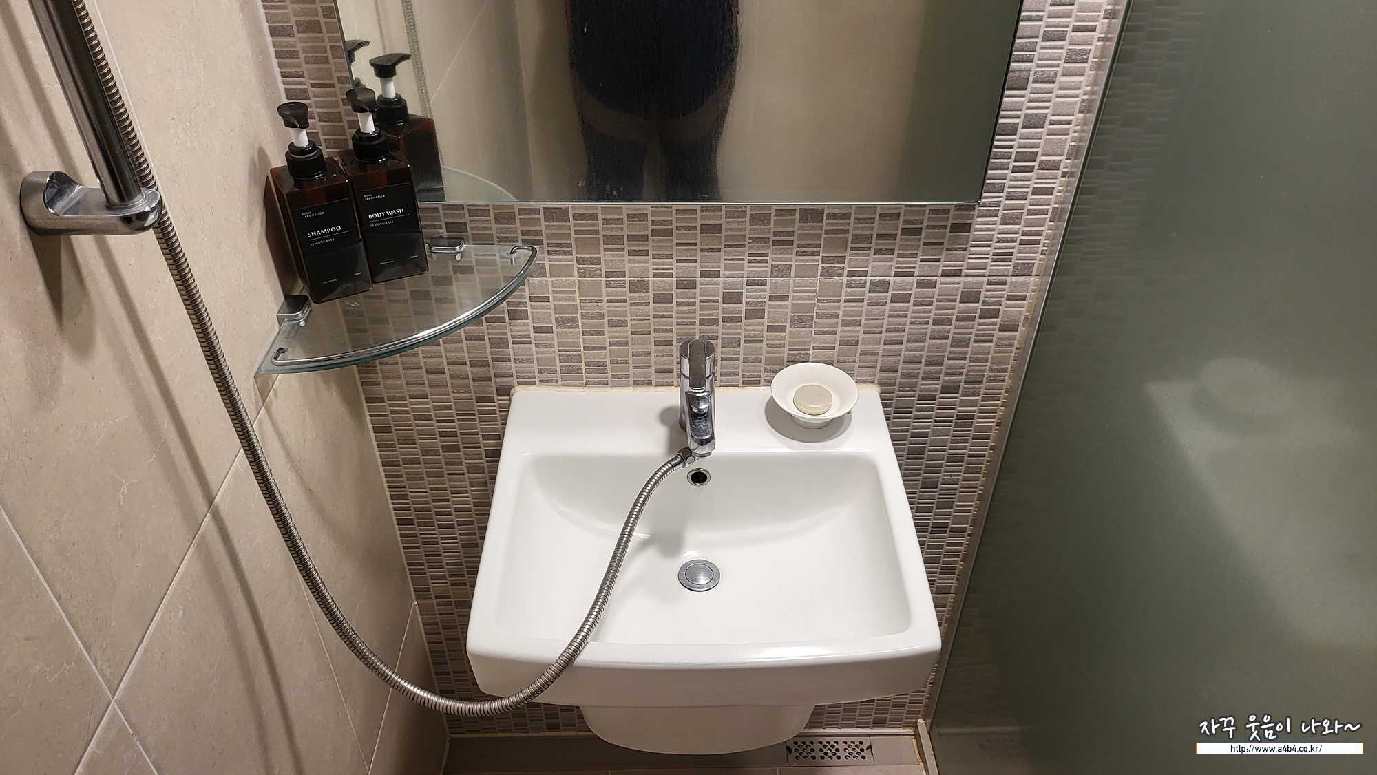 화장실은 깔끔한 작은 화장실 생각하시고요. 소노문 델피노 설악 리조트는 천연 온수가 공급된다고 합니다. 욕조는 없고요. 비누와 샴푸, 바디워시가 제공됩니다.