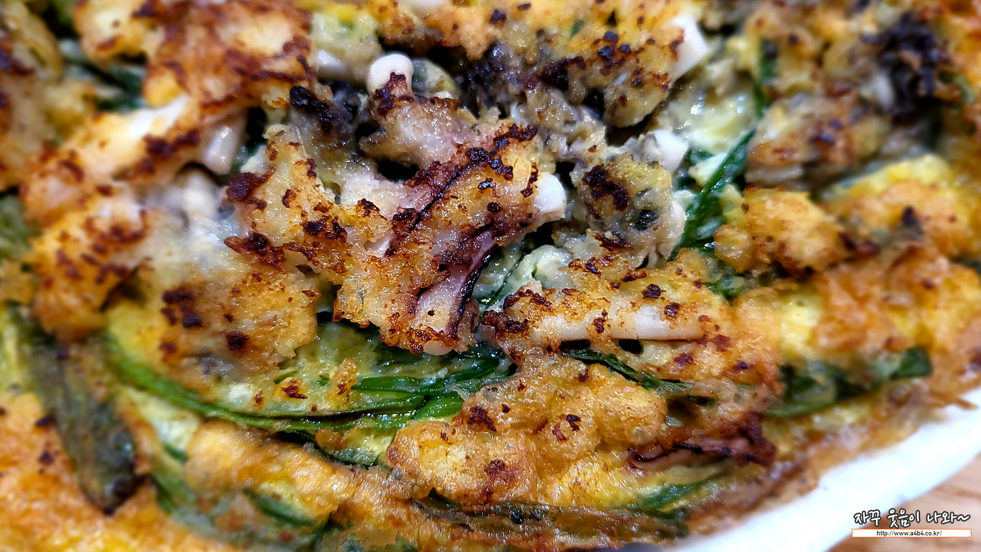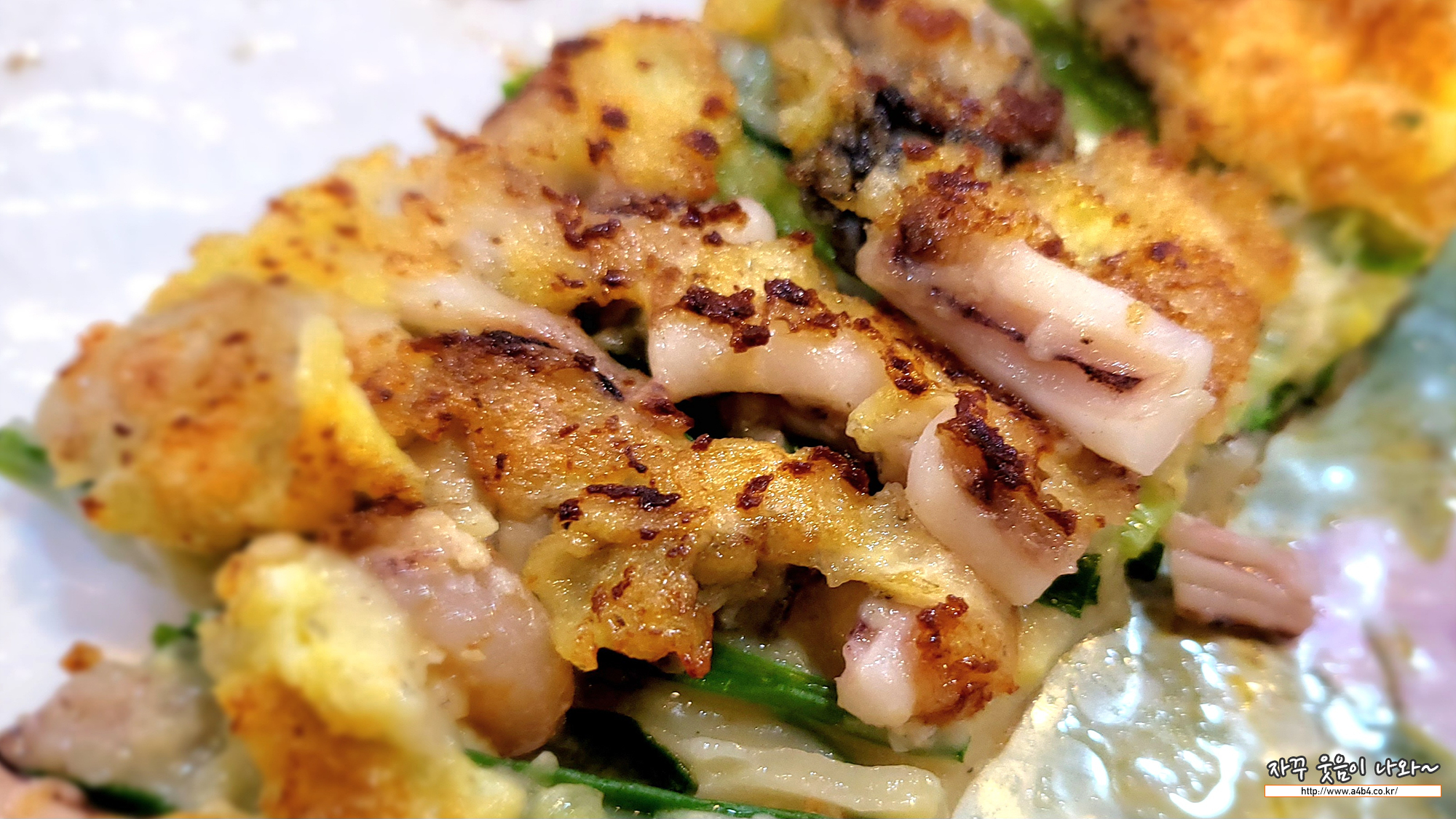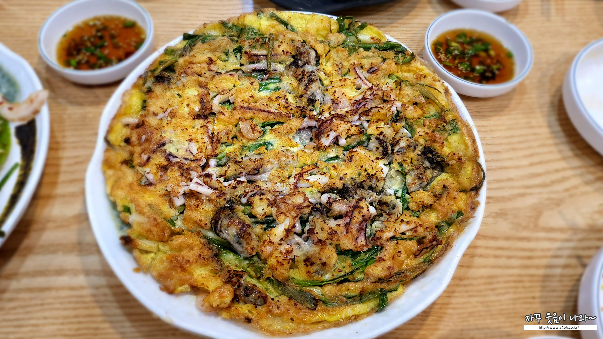 해물파전에는 굴과 오징어, 새우가 메인으로 들어가 있습니다. 바삭하게 잘 구어서 나왔네요.