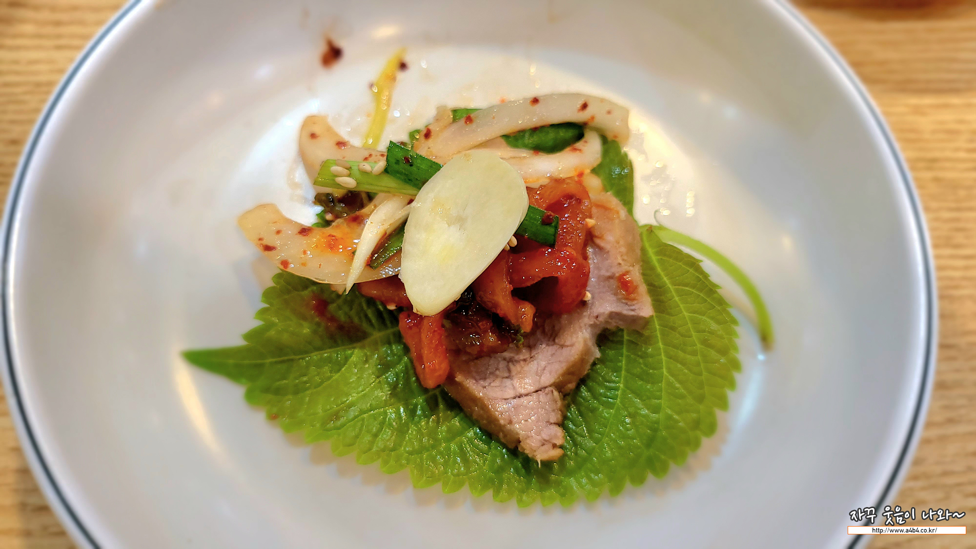 돼지보쌈과 함께 보쌈무김치와 양파 파절이, 마늘이 같이 나오네요. 상추는 없고 깻잎이 나옵니다.