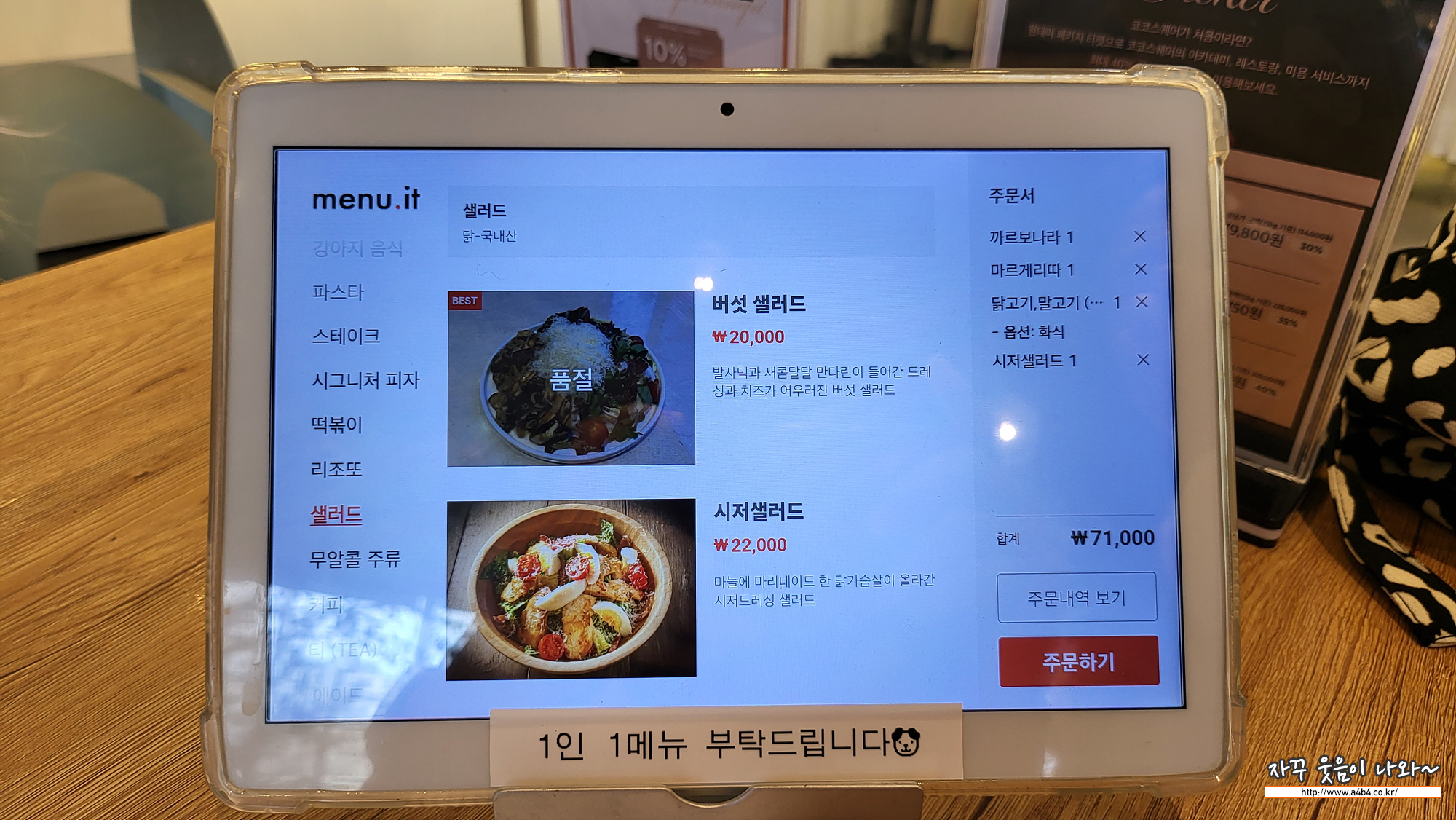 코코스퀘어 현대프리미엄아울렛 스페이스원점 셀러드는 두 가지 메뉴가 있는데요. 버섯 샐러드는 품절이어서 뭐 반 강제로? 시저 샐러드를 주문 했습니다.